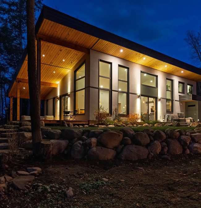 La Résidence Olivier située au bord du Lac Boowker à Orford se caractérise par son plafond unique qui rappelle celui d’un aréna. Cette maison qui est présentement en vente se détaille pour pratiquement 2 millions de dollars. La Résidence Olivier est parfaite pour accueillir des invités avec son immense table dans la salle à manger ainsi qu’un dortoir pouvant accueillir 10 personnes. La demeure est faite avec quatre matériaux naturels: pierre, granit poli, bois et acier dans le but de bien s’intégrer à la nature.De plus elle figure dans la revue Canadienne d’architecture ABCP, ARQ et architecture Québec.