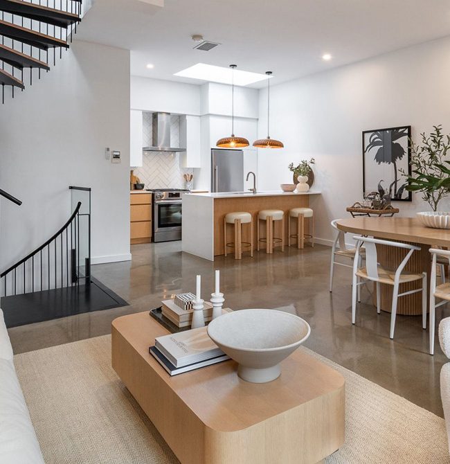À proximité, la salle à manger se déploie dans un décor lumineux et invitant. On imagine facilement une grande table dressée pour recevoir amis et proches, dans une atmosphère où la convivialité prend toute sa place. Les repas deviennent de véritables moments de partage et de plaisir, sublimés par l’ambiance harmonieuse qui règne dans cette pièce.