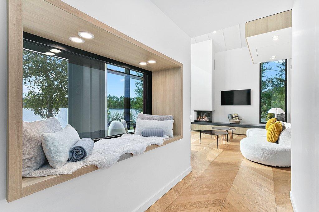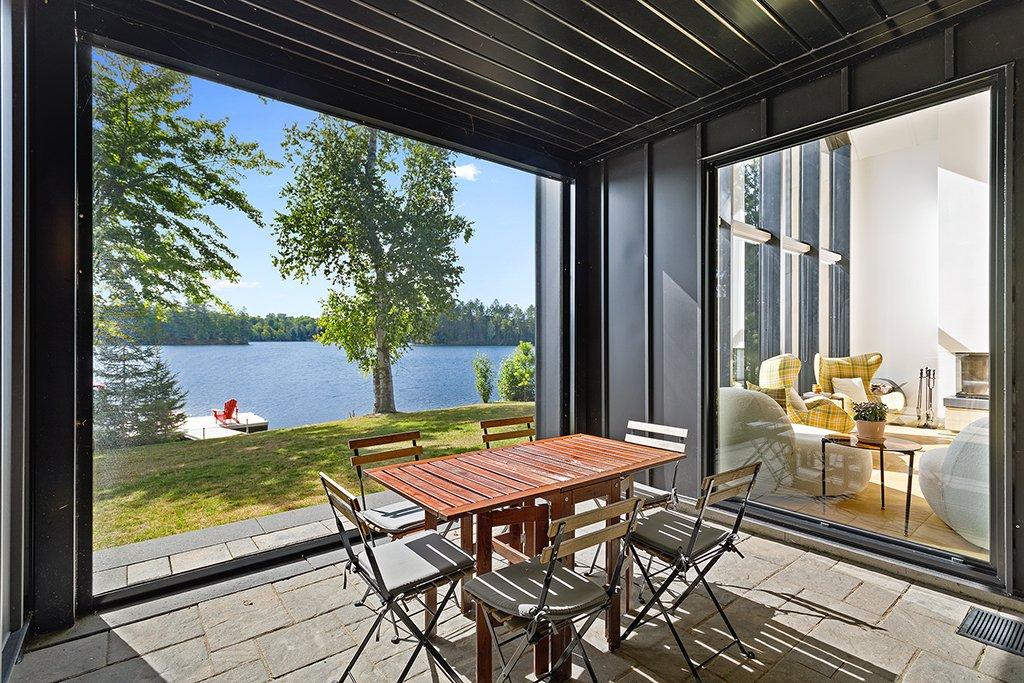 Le salon, quant à lui, est une pièce maîtresse. Son immense mur vitré ouvre sur le lac, donnant une impression de continuité entre l’intérieur et l’extérieur. Le foyer panoramique à bois ajoute une touche chaleureuse à l’ensemble, rendant l’espace aussi accueillant que spectaculaire. C’est l’endroit idéal pour se détendre, lire, discuter ou simplement contempler la nature environnante, au fil des saisons.