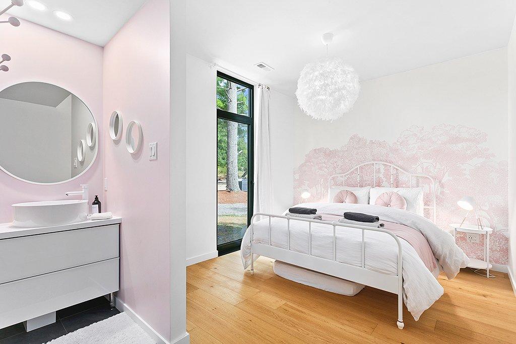 Dès le pas de la porte franchi, on est frappé par la luminosité qui baigne l’intérieur. La conception à aire ouverte crée une fluidité naturelle entre les espaces de vie, mettant en valeur les volumes et la lumière. Le design intérieur est soigné, avec des matériaux nobles et une palette de couleurs douces qui renforcent l’ambiance sereine du lieu. Les planchers chauffants contribuent à un confort douillet, été comme hiver, et l’on sent immédiatement que cette maison a été pensée pour être vécue pleinement, avec raffinement et simplicité.