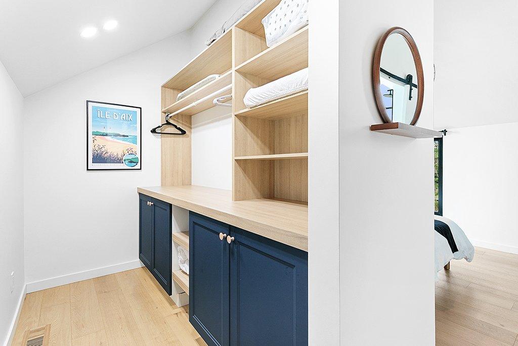 La maison dispose d’une mezzanine accessible par un escalier motorisé, qui mène à une charmante chambre à coucher. Cet espace peut aussi facilement être transformé en bureau ou en espace d’entraînement, selon les besoins. Grâce à son emplacement en hauteur, il offre une vue imprenable sur le lac, et devient rapidement une zone paisible pour s’isoler ou travailler dans le calme.