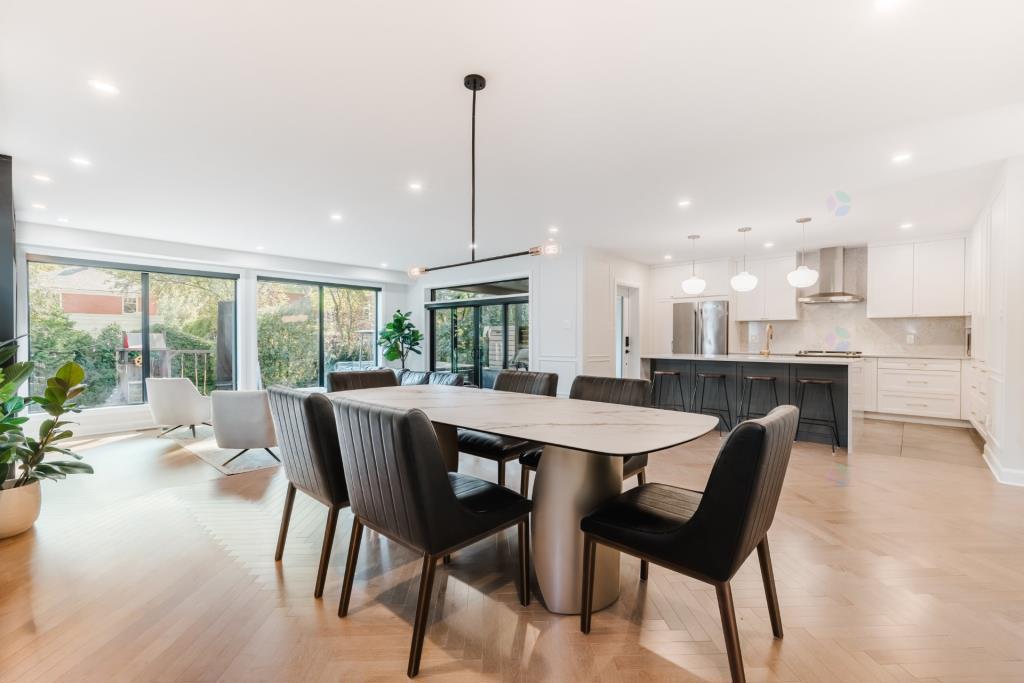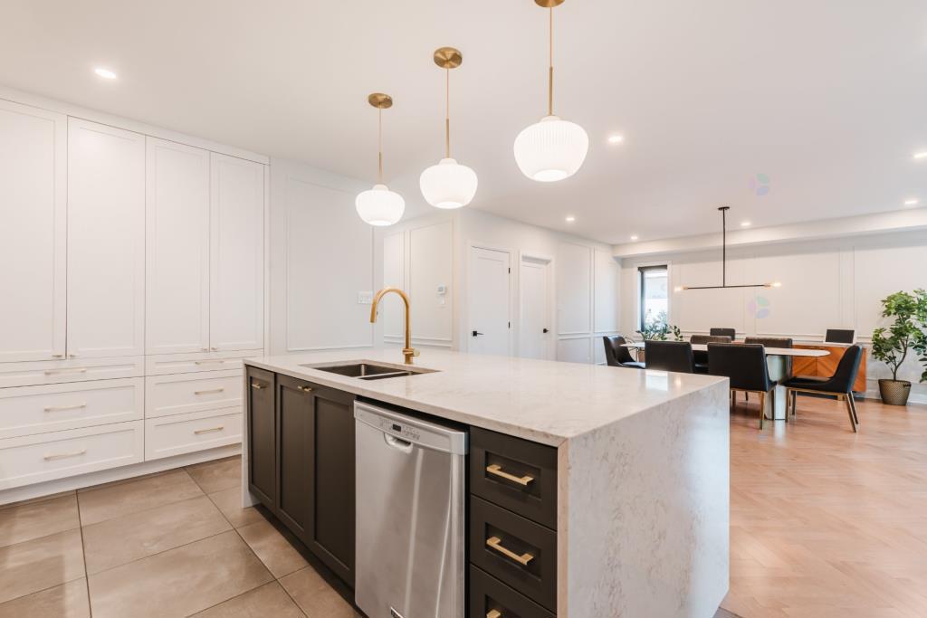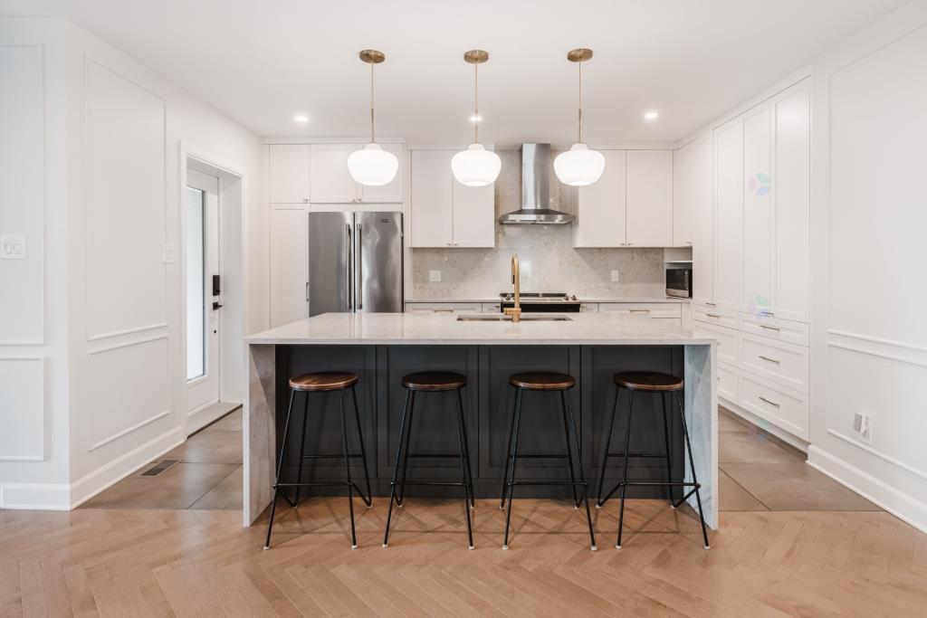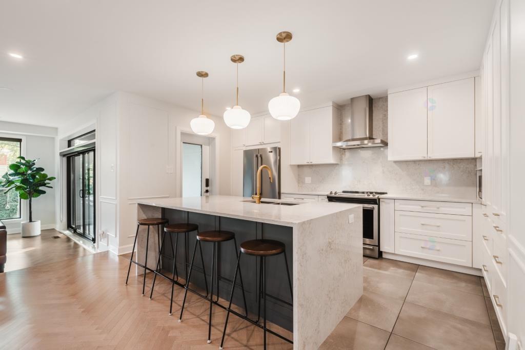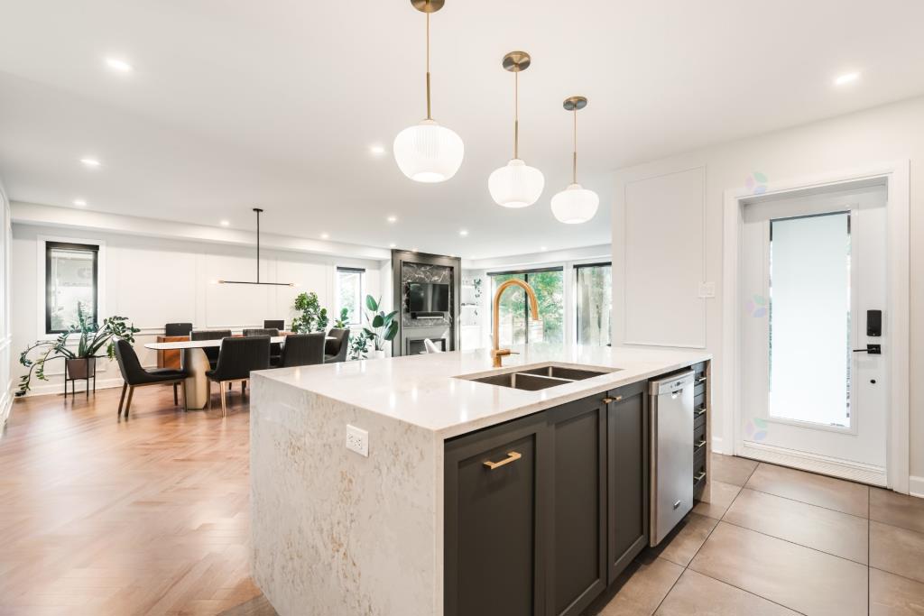 Le rez-de-chaussée s’organise autour d’une grande aire ouverte qui regroupe la cuisine, le salon et la salle à manger. Cet espace, véritable cœur de la maison, est inondé de lumière naturelle grâce à un mur arrière entièrement vitré. L’extension arrière, réalisée avec soin, a permis d’agrandir considérablement cette pièce de vie, qui respire désormais la grandeur et la convivialité. Le plancher en bois disposé en chevron ajoute une touche de distinction tout en apportant chaleur et caractère à l’ensemble.