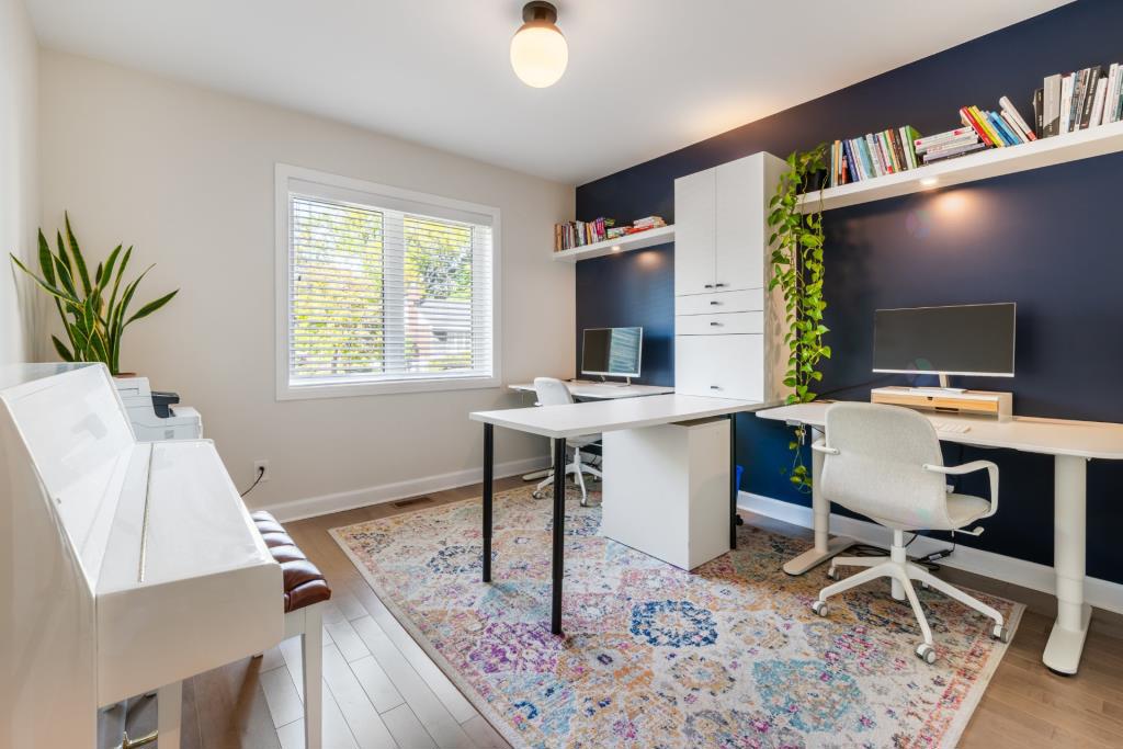 Le rez-de-chaussée comprend également un bureau fermé, idéal pour le télétravail ou pour disposer d’un espace tranquille dédié aux projets personnels. Une élégante salle d’eau complète ce niveau, ajoutant encore à la fonctionnalité de la maison.