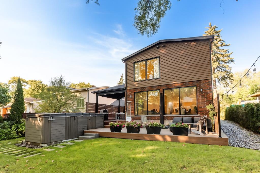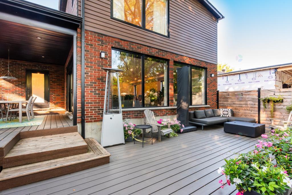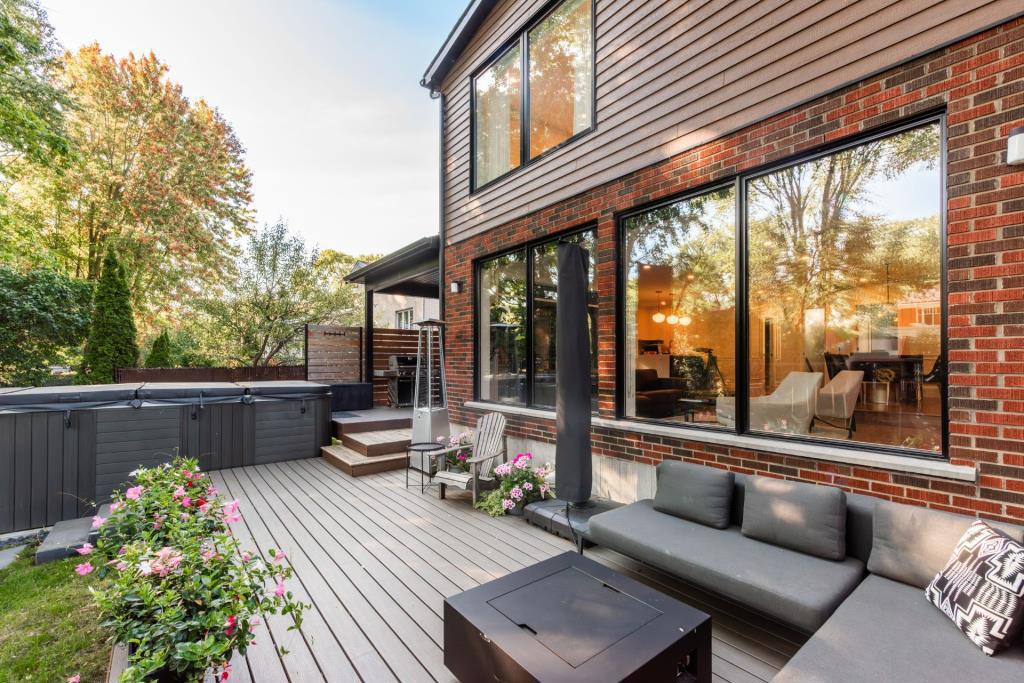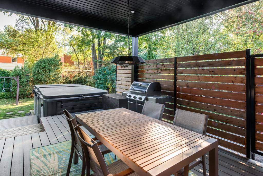 À l’extérieur, le terrain de 7 400 pieds carrés est un véritable coin de paradis. Entièrement aménagé, il offre un environnement intime et verdoyant, parfait pour profiter de la belle saison. La terrasse couverte permet de manger dehors, que ce soit en famille ou entre amis, et un coin barbecue complète idéalement cet espace convivial. Le spa ajoute une touche de luxe à l’ensemble, tandis qu’une zone détente et des jeux pour enfants rendent la cour aussi agréable pour les adultes que pour les plus jeunes. Le garage intégré, ainsi que l’aménagement paysager soigné, viennent renforcer la valeur et la praticité de cette résidence.