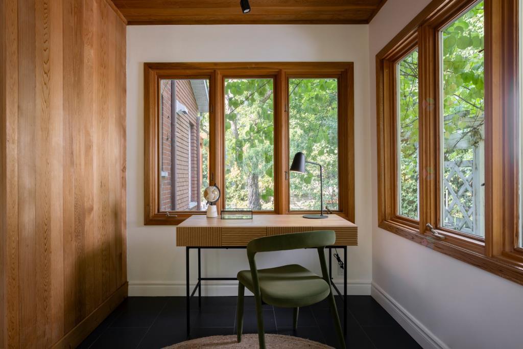 Toujours au rez-de-chaussée, un espace bureau a été prévu, baigné de lumière grâce à de larges fenêtres. Il offre une vue apaisante sur la verdure, ce qui en fait un lieu idéal pour la concentration ou la créativité.