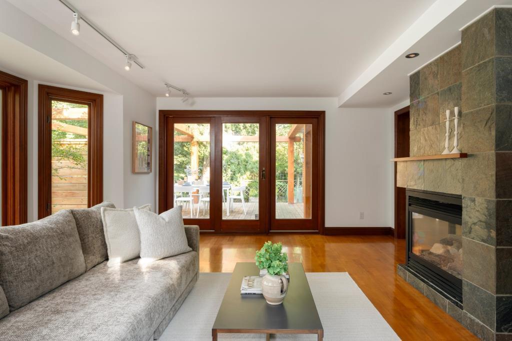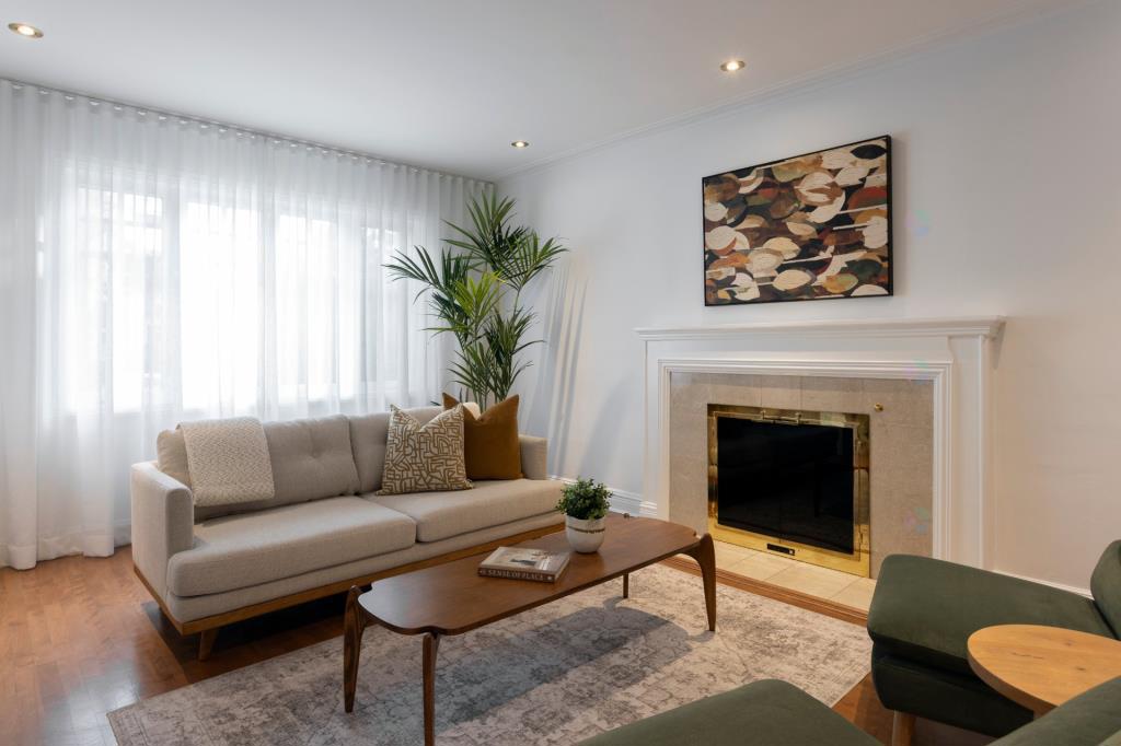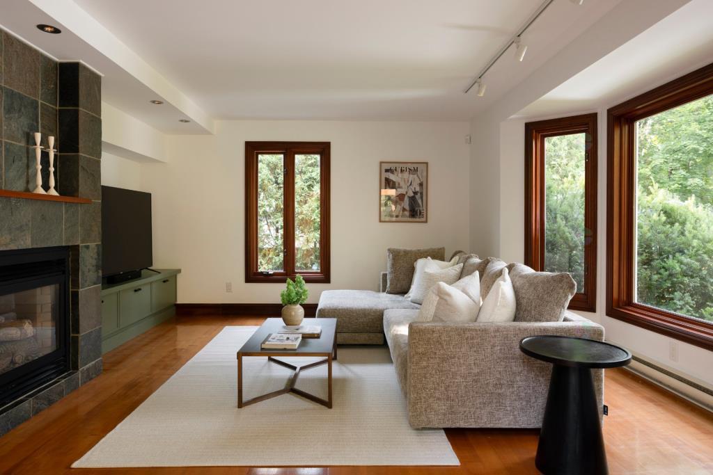Le salon principal est vaste et baigné de lumière naturelle. Son foyer constitue le point central, ajoutant une touche de noblesse à l’ensemble. Cet espace devient rapidement un lieu de rassemblement idéal, que ce soit pour recevoir des amis dans une ambiance conviviale ou simplement pour s’accorder un moment de lecture paisible. Chaque détail y inspire confort et raffinement.
