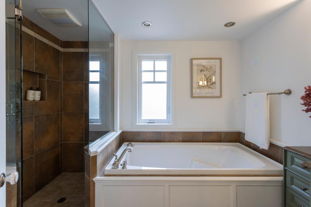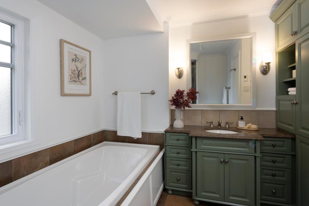 La salle de bain de l’étage invite au bien-être et à la relaxation. Aménagée pour offrir le meilleur des deux mondes, elle permet de démarrer la journée avec énergie grâce à une douche fonctionnelle, ou de la terminer en douceur dans un bain réconfortant. C’est un lieu intime et raffiné, pensé pour répondre aux besoins du quotidien tout en intégrant une dimension de détente.
