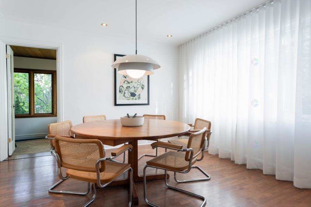 La salle à manger se distingue par son volume et son charme. Une grande fenêtre inonde la pièce de lumière, créant une atmosphère propice aux repas animés et aux discussions qui se prolongent jusque tard. On y imagine sans peine de belles tablées, réunissant famille et proches autour d’un repas chaleureux. L’agencement permet d’accueillir aisément une grande table et de conserver une impression d’espace.