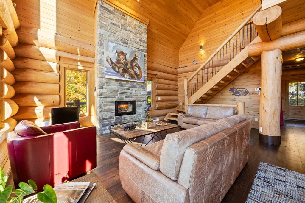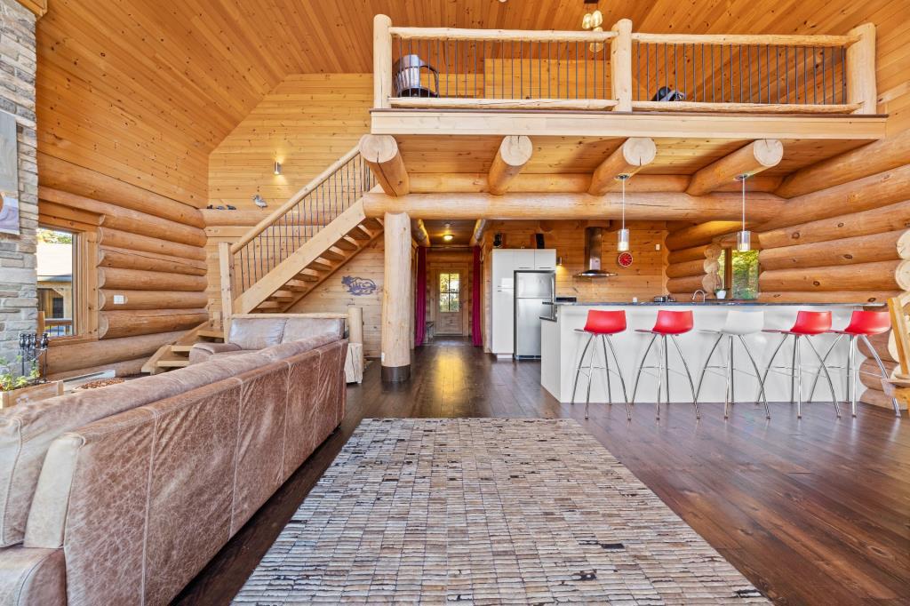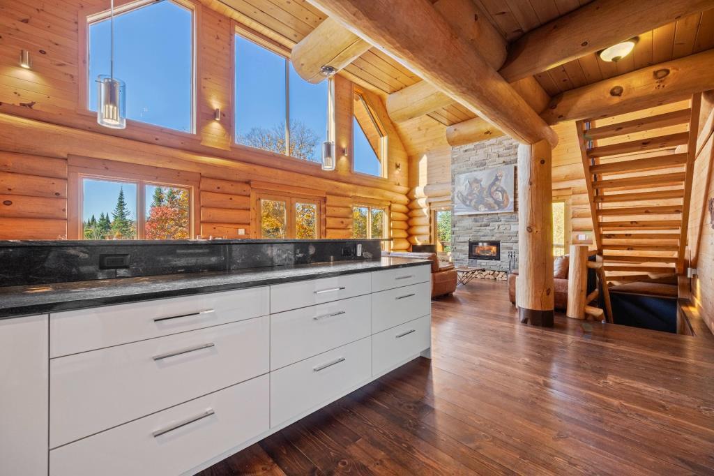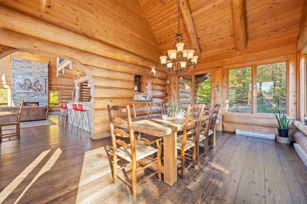 La grande aire ouverte du rez-de-chaussée accueille les visiteurs dans une ambiance douce et feutrée, où le bois rond enveloppe chaque mur, chaque recoin, et crée une atmosphère réconfortante. Le salon, vaste et invitant, est dominé par un foyer au bois qui deviendra sans aucun doute le cœur des soirées d’hiver. On s’y imagine facilement blotti dans un fauteuil, un livre à la main, ou partagé entre amis autour d’un bon vin. L’espace est conçu pour la convivialité tout autant que pour la tranquillité, baigné de lumière et d’harmonie.