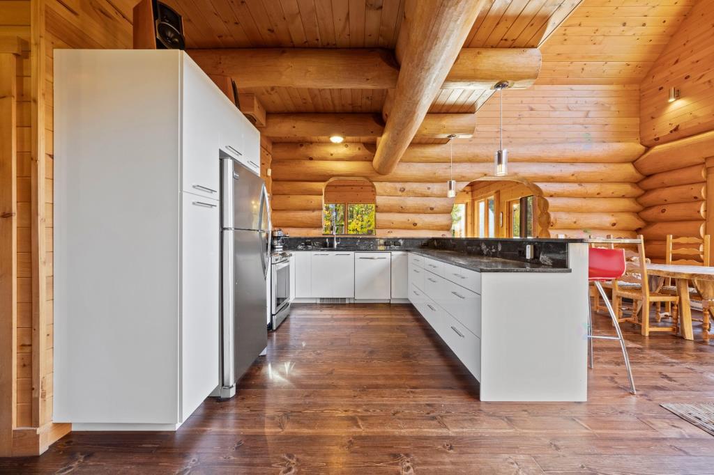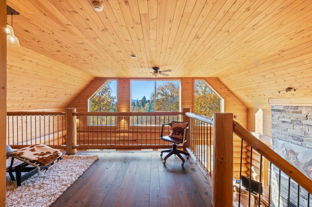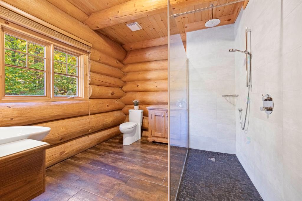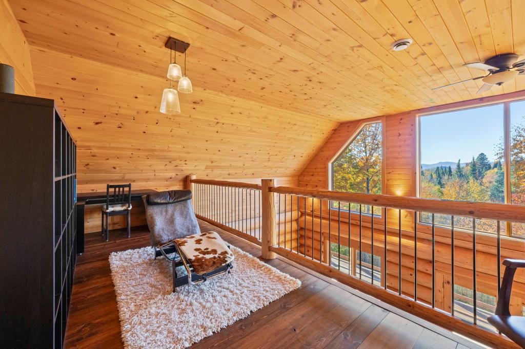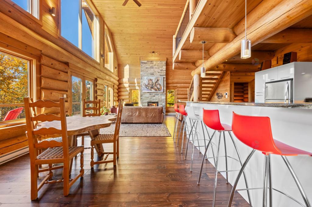 La grande aire ouverte du rez-de-chaussée accueille les visiteurs dans une ambiance douce et feutrée, où le bois rond enveloppe chaque mur, chaque recoin, et crée une atmosphère réconfortante. Le salon, vaste et invitant, est dominé par un foyer au bois qui deviendra sans aucun doute le cœur des soirées d’hiver. On s’y imagine facilement blotti dans un fauteuil, un livre à la main, ou partagé entre amis autour d’un bon vin. L’espace est conçu pour la convivialité tout autant que pour la tranquillité, baigné de lumière et d’harmonie.