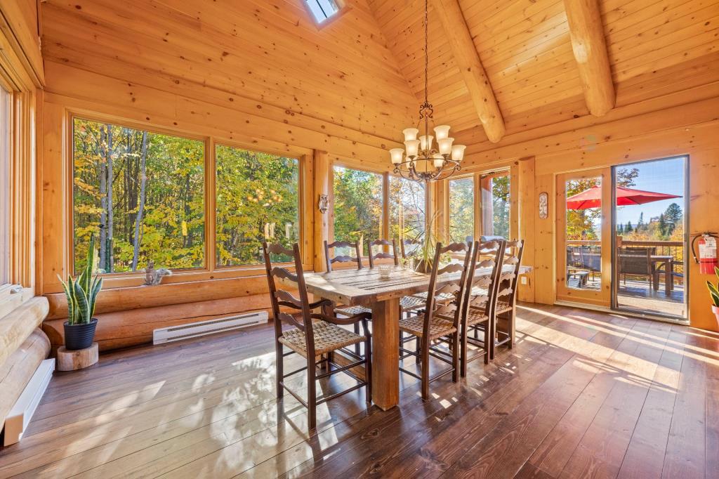 La salle à manger principale, séparée mais tout aussi accueillante, permet de recevoir en grand. Sa superficie généreuse offre amplement d’espace pour une grande tablée, idéale pour les soupers festifs ou les rassemblements de famille. Les larges fenêtres y apportent une belle luminosité et un contact direct avec la nature environnante, rendant chaque repas un moment à part.