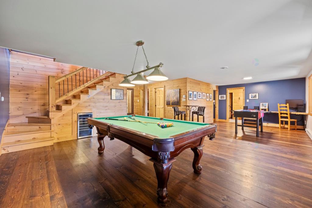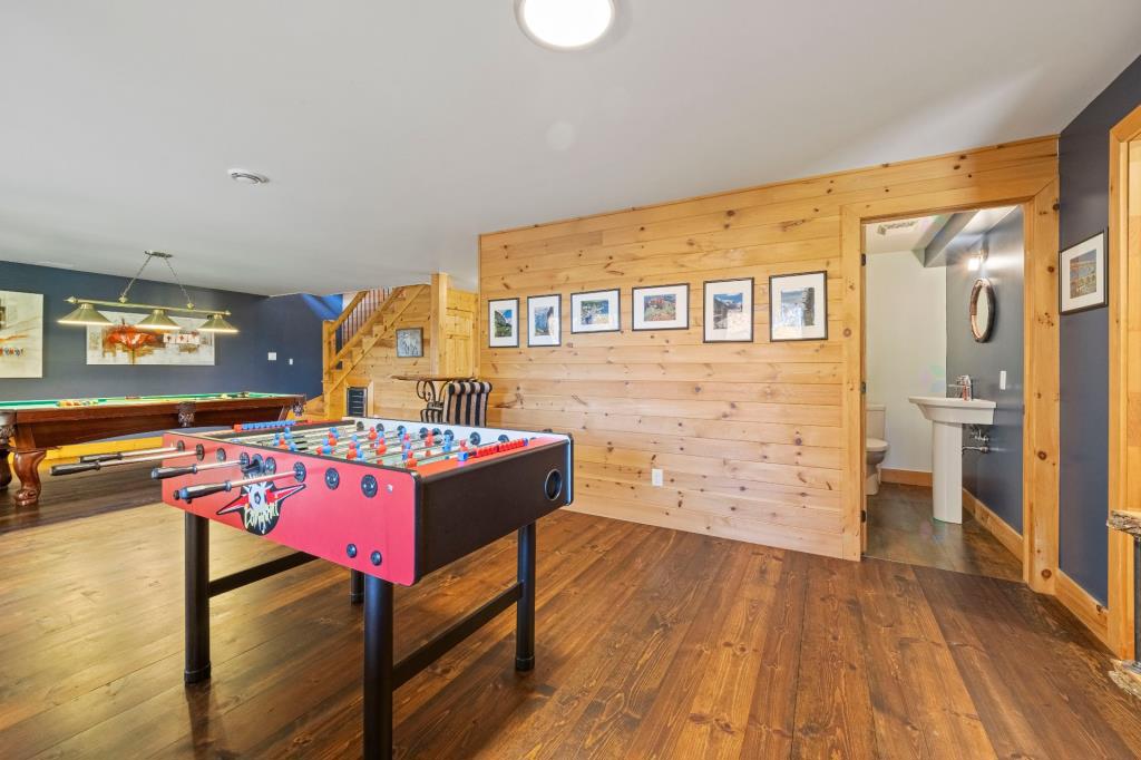 Le rez-de-jardin propose un espace de vie complémentaire sous la forme d’une grande salle de jeux ou de divertissement. Qu’il s’agisse de soirées cinéma, de tournois de jeux ou de simples moments de détente, cet espace polyvalent s’adapte à tous les styles de vie et à toutes les envies. Il ajoute à la maison une dimension familiale et festive qui s’accorde parfaitement avec son ambiance générale.