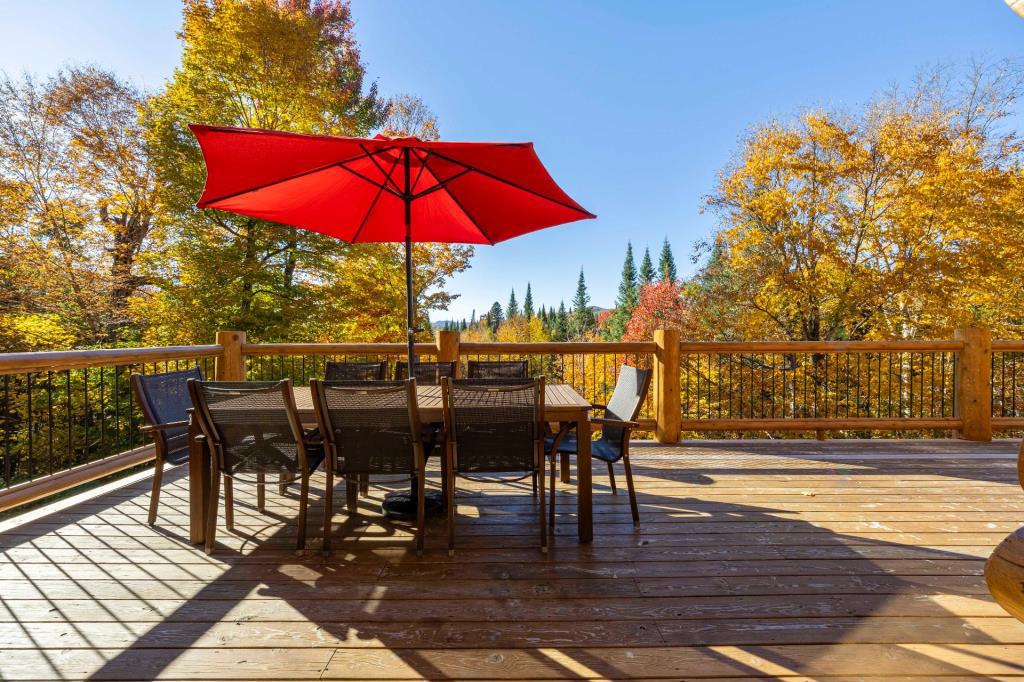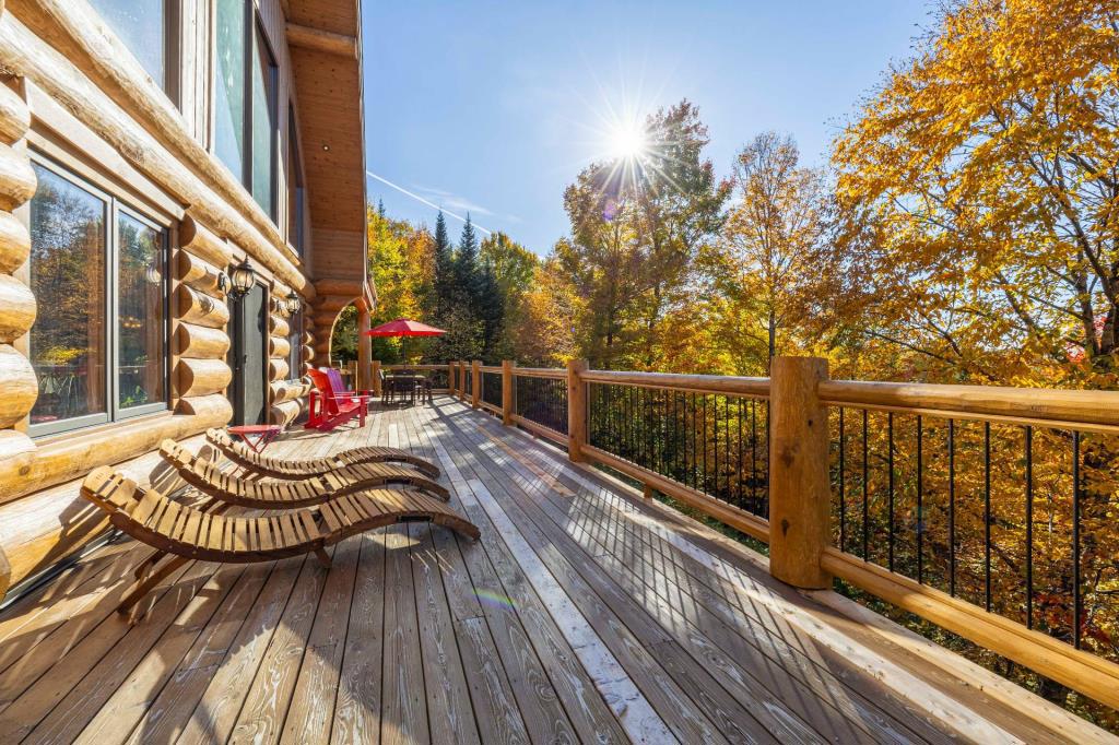 À l’extérieur, la grande terrasse de près de 700 pieds carrés s’impose comme un véritable prolongement de la maison. C’est un lieu parfait pour profiter de l’air pur, organiser des repas sous le soleil ou simplement savourer un café en regardant les saisons défiler.