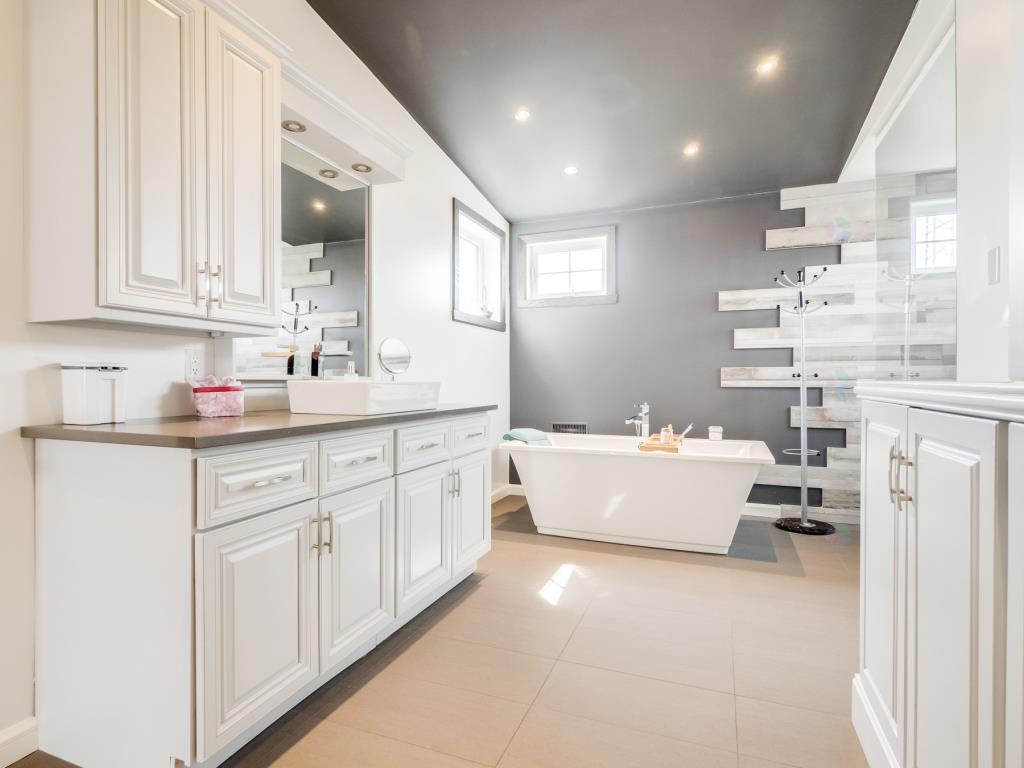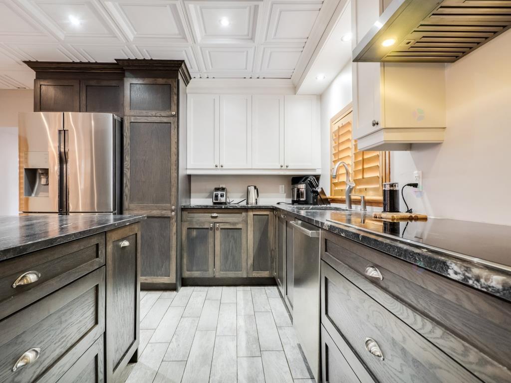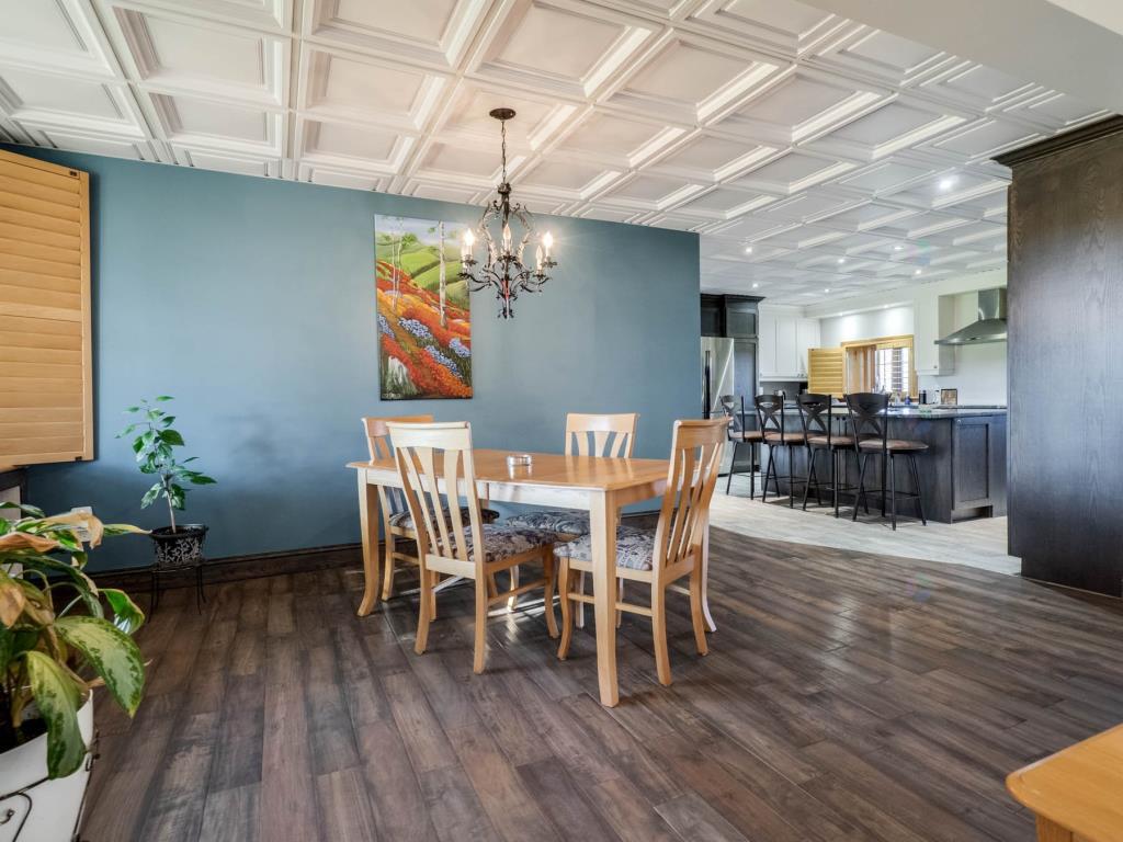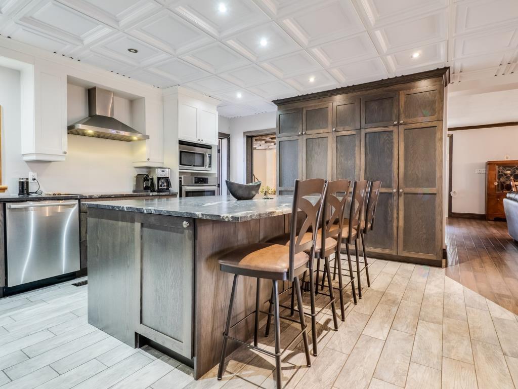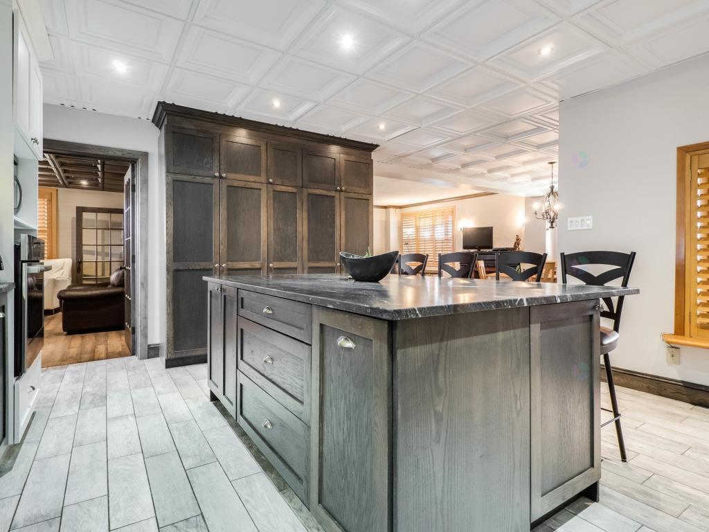 La cuisine, entièrement refaite, se distingue par son aménagement pratique et élégant. Avec ses armoires jusqu’au plafond, elle offre un rangement abondant, tandis que le grand îlot central, équipé d’un comptoir lunch pouvant accueillir quatre personnes, devient le cœur de la maison. C’est un lieu parfait pour prendre un café le matin, préparer des repas informels ou simplement discuter en cuisinant. Chaque détail a été pensé pour que tout soit à portée de main et pour que la cuisine devienne un espace convivial et fonctionnel pour la famille et les invités.