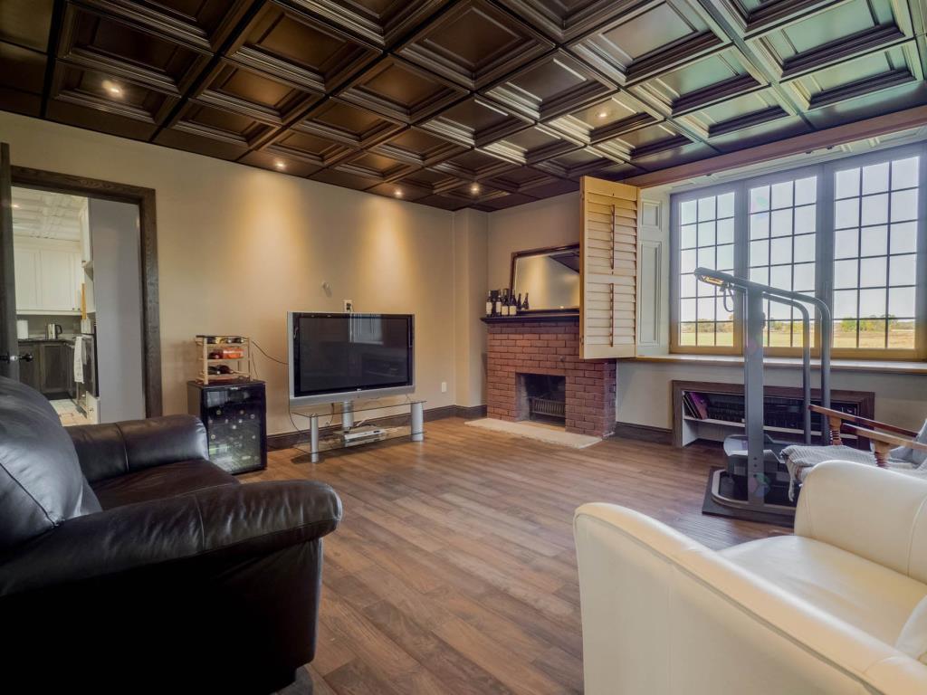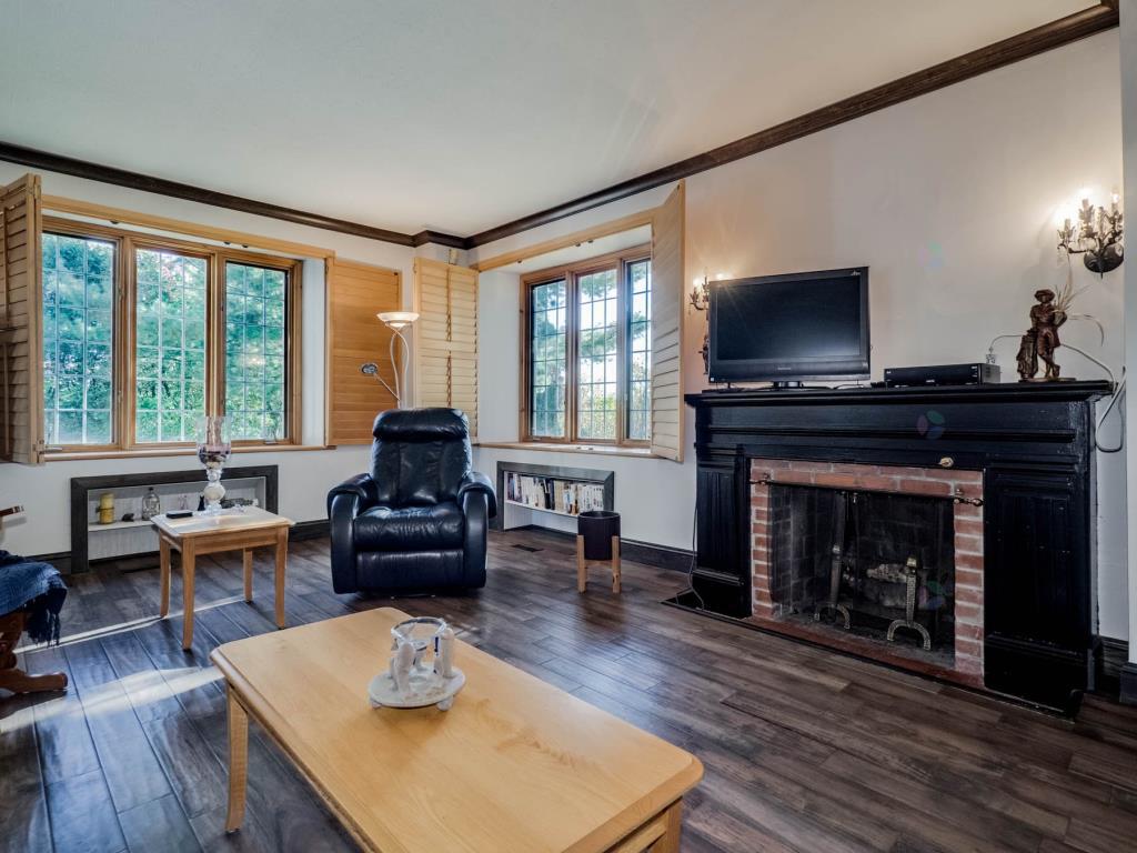 Le salon principal, spacieux et invitant, constitue un espace parfait pour profiter de soirées cinéma ou simplement se détendre au coin du feu. L’un des trois foyers au bois de la maison y ajoute une touche de chaleur et de confort, créant une ambiance apaisante et réconfortante.