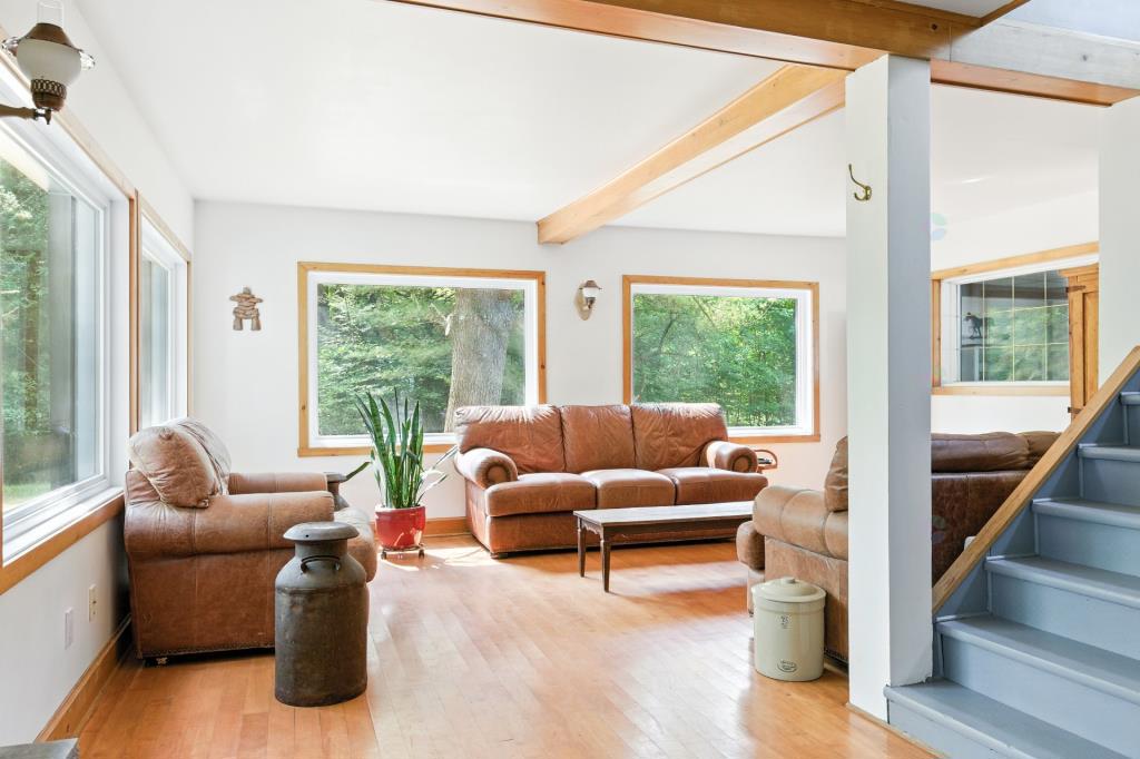 Le salon, intime et accueillant, complète l’espace de vie. Parfait pour lire, se détendre ou recevoir des amis, il offre également une vue dégagée sur la verdure environnante. Les grandes fenêtres laissent pénétrer la lumière naturelle, illuminant l’espace et mettant en valeur les finitions soignées de la maison. Cet espace combine élégance et confort, créant un cadre idéal pour la vie quotidienne ou pour recevoir dans une atmosphère chaleureuse.