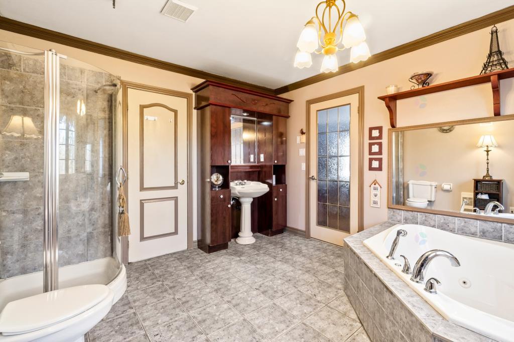À l’étage, la chambre principale se distingue par son vaste espace et son atmosphère apaisante. Elle comprend un walk-in pratique pour organiser vos vêtements ainsi qu’une salle de bain attenante, idéale pour bien commencer ou terminer la journée. C’est un véritable refuge où règnent le confort et la tranquillité.