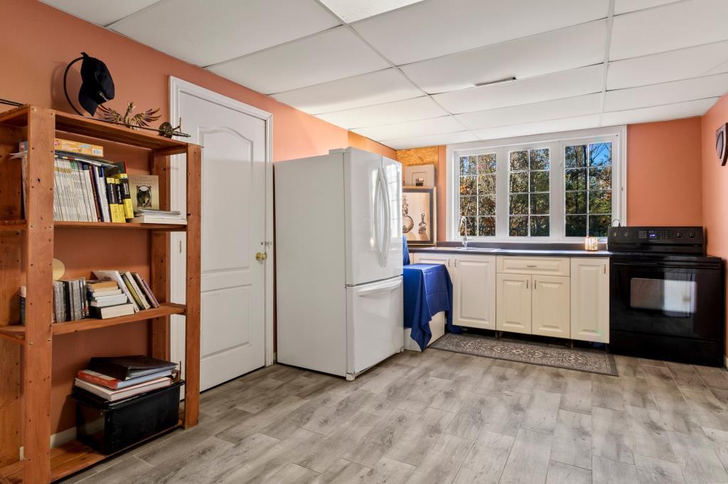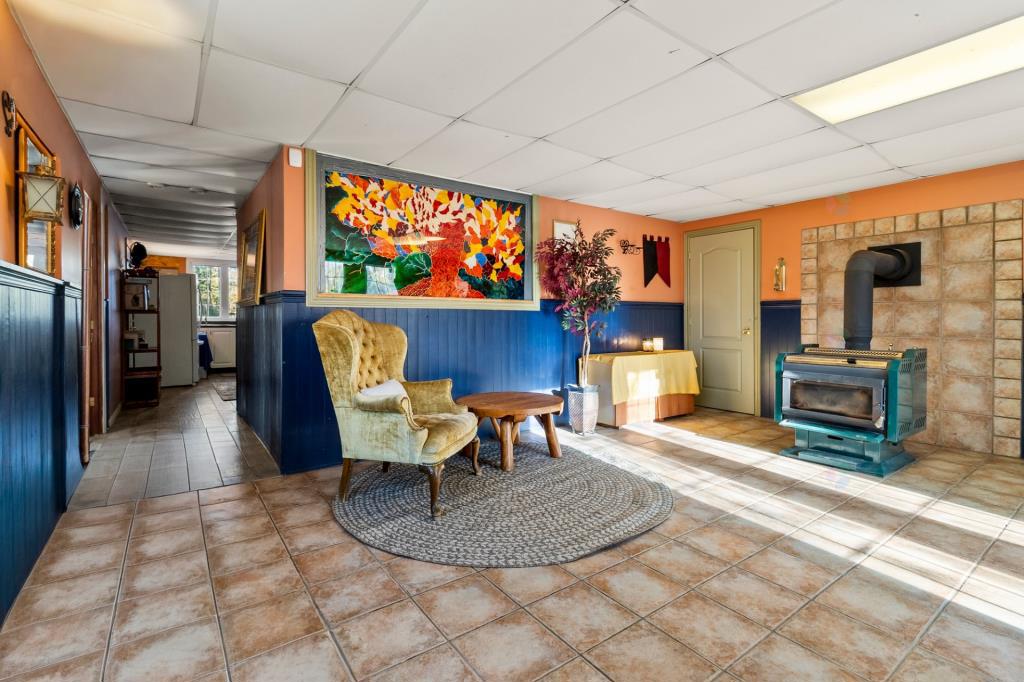La visite se poursuit dans une grande aire ouverte qui constitue le véritable cœur de la maison. On y trouve un vaste bureau, la cuisine principale, une seconde salle à manger et un salon convivial. Les volumes impressionnent par leur générosité, et la disposition des pièces favorise les moments partagés autant que les instants de quiétude. C’est un lieu où il fait bon vivre, que ce soit pour travailler dans le calme, cuisiner en famille ou se rassembler autour du foyer lors des soirées d’hiver.