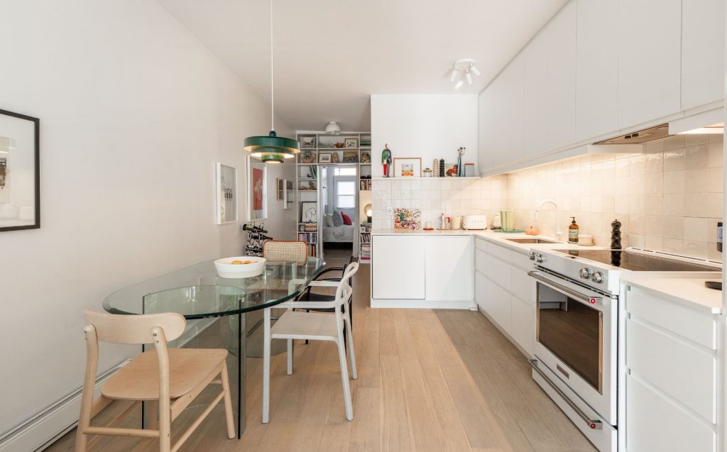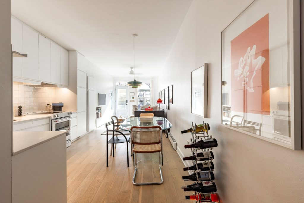 L’espace salle à manger, adjacent à la cuisine, permet de recevoir famille et amis dans une ambiance détendue. On peut facilement y installer une belle table, créant ainsi un espace accueillant pour partager un repas ou prolonger les conversations après le dîner.