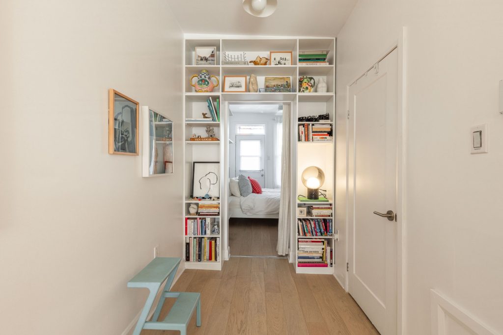Avant d’arriver à la chambre à coucher, un superbe mur bibliothèque attire le regard. Véritable coup de génie, cette installation maximise l’espace tout en ajoutant une touche décorative remarquable. Elle permet d’exposer des livres, des œuvres ou de petites décorations qui personnalisent l’espace et le rendent unique. Cette bibliothèque devient un élément central de la circulation, liant harmonieusement les différentes zones du condo.