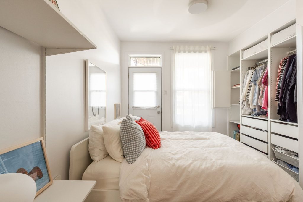 La chambre principale, quant à elle, est un véritable espace de détente. Spacieuse et bien pensée, elle dispose d’un grand espace de rangement qui facilite l’organisation du quotidien. Les placards intégrés permettent de ranger vêtements, chaussures et accessoires sans encombrer la pièce. La lumière naturelle y est douce et tamisée, créant une atmosphère propice au repos. On s’y sent bien, dans une ambiance intime et sereine. Depuis la chambre, on accède directement à la terrasse, un atout indéniable de cette propriété.