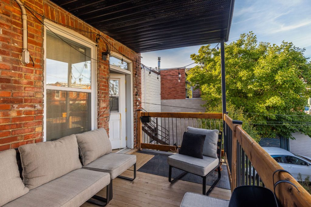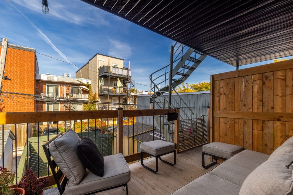 Cette terrasse arrière, véritable prolongement du lieu de vie, représente un espace privilégié pour profiter de la belle saison. On peut y prendre le soleil, lire ou recevoir des amis pour un souper d’été. L’endroit est à la fois paisible et inspirant, entouré d’une verdure qui apporte une touche de nature au cœur de la ville. C’est un lieu parfait pour se détendre et savourer les beaux jours, loin du tumulte tout en restant à proximité de tout.