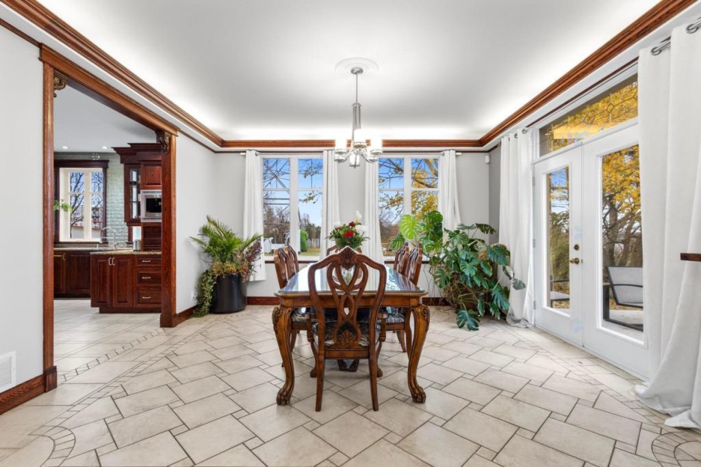 À proximité immédiate, la salle à manger prend place dans un espace lumineux, pensée pour accueillir famille et amis. Grâce à ses grandes fenêtres et ses portes vitrées, elle bénéficie d’une luminosité abondante tout au long de la journée. Elle peut facilement accueillir une grande table, idéale pour les célébrations, les soupers festifs ou les repas animés. L’ambiance qui s’en dégage est celle d’un lieu invitant où l’on aime prolonger les conversations, apprécier la vue sur l’extérieur ou profiter d’un moment de partage autour d’un bon repas.