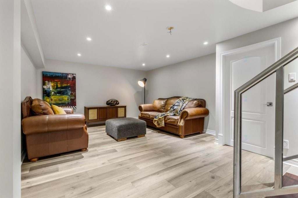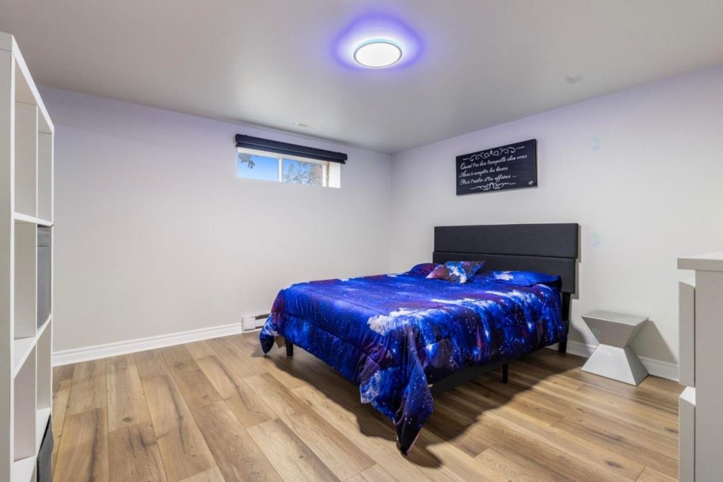 Le sous-sol, vaste et polyvalent, propose une grande salle familiale où l’on retrouve un coin salon propice aux discussions, aux jeux ou à la lecture. Deux chambres supplémentaires s’y trouvent également, dont l’une est actuellement utilisée comme bureau. Cet étage devient un lieu polyvalent, parfait pour accueillir davantage de membres de la famille, créer un espace de travail isolé ou aménager une zone pour les loisirs.