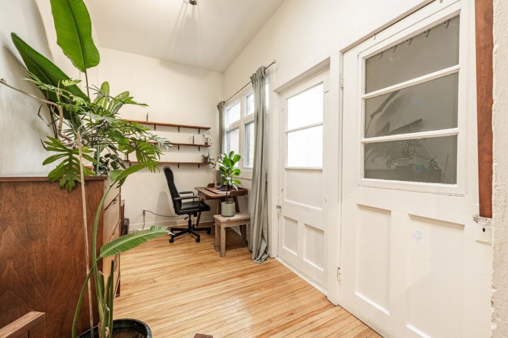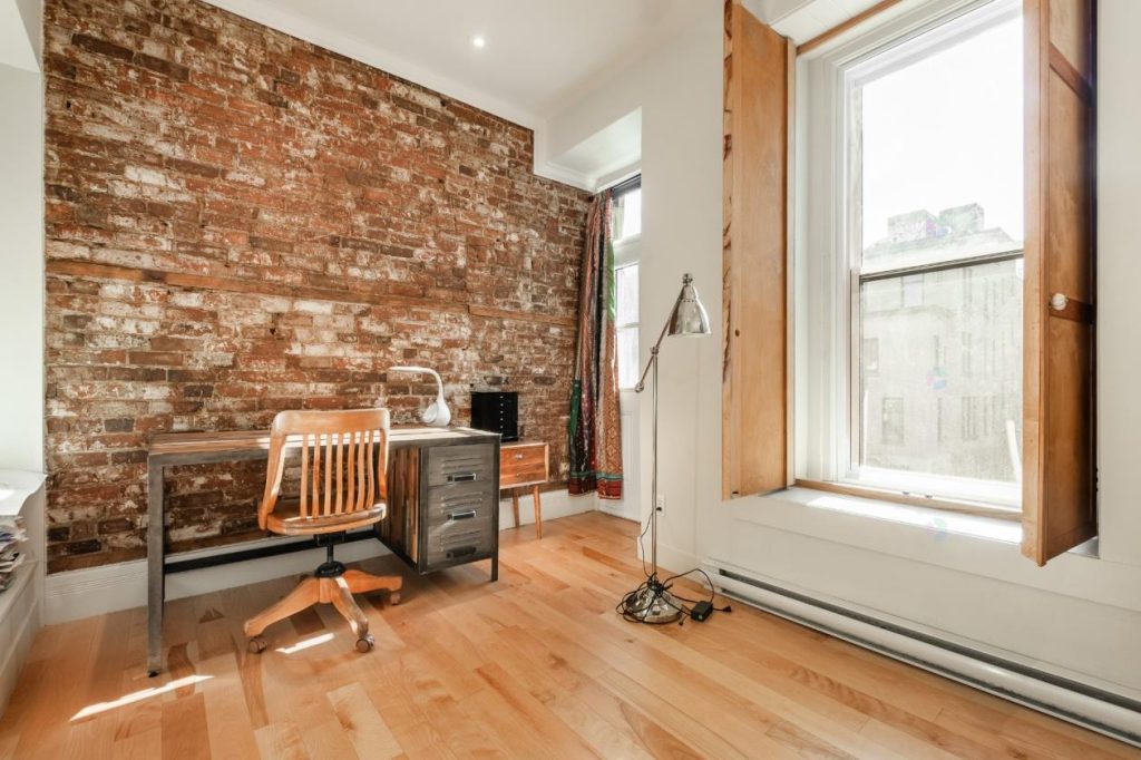 La vaste et lumineuse chambre principale est un espace de détente, offrant le cadre idéal pour un repos serein. Elle intègre également un coin bureau près du mur de briques apparentes, parfait pour se concentrer sur ses projets. Cette pièce se prête autant à la détente qu’à la concentration.