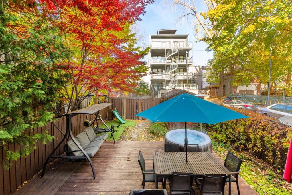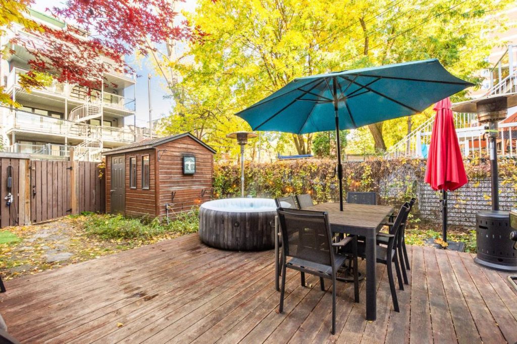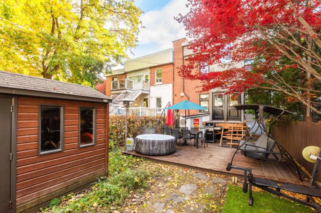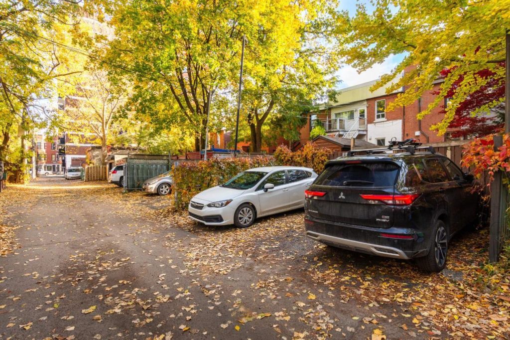 À l’arrière, la cour intime constitue un coin de paradis en pleine ville. Bordée d’arbres matures, elle procure une sensation de tranquillité rare. La terrasse en cèdre invite à profiter des repas à l’extérieur durant la belle saison, tandis que le balcon en composite, récemment installé, offre une durabilité appréciable. Le raccordement au gaz naturel pour le BBQ facilite les soirées estivales, et le stationnement extérieur, pouvant accueillir jusqu’à trois véhicules, ajoute une valeur exceptionnelle à la propriété.
