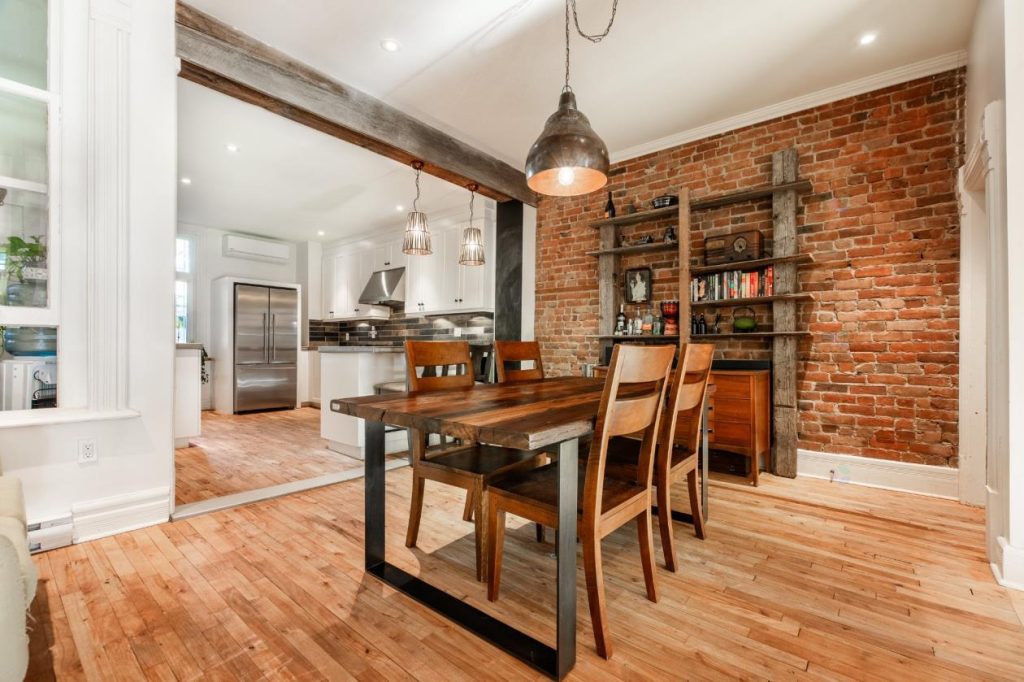 La salle à manger, située à quelques pas, s’inscrit naturellement dans la continuité de cet espace fluide. Elle permet d’accueillir une grande table, idéale pour recevoir famille et amis. Le mur de briques apparentes ajoute une texture authentique et un charme indéniable à la pièce. Cette présence chaleureuse crée une ambiance propice aux longs soupers, aux rires partagés et aux conversations qui s’étirent tard en soirée.