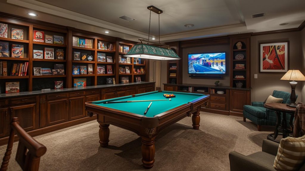Une salle de jeux bien conçue nécessite un éclairage par zones afin de s’adapter à différentes activités et ambiances. Un éclairage vif et ciblé est essentiel au-dessus d’un billard, tandis qu’un éclairage plus tamisé et ambiant contribue à créer une atmosphère plus intime dans les autres zones. La flexibilité est essentielle, avec des zones d’éclairage à commande individuelle ou des ambiances prédéfinies permettant de s’adapter aux différents moments de la journée et à divers types de divertissement. Cela garantit que l’espace peut passer facilement d’une soirée de jeux animée à une réunion sociale détendue.