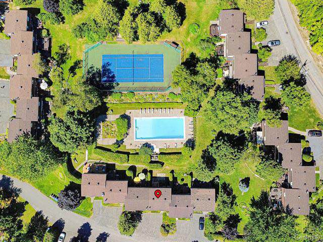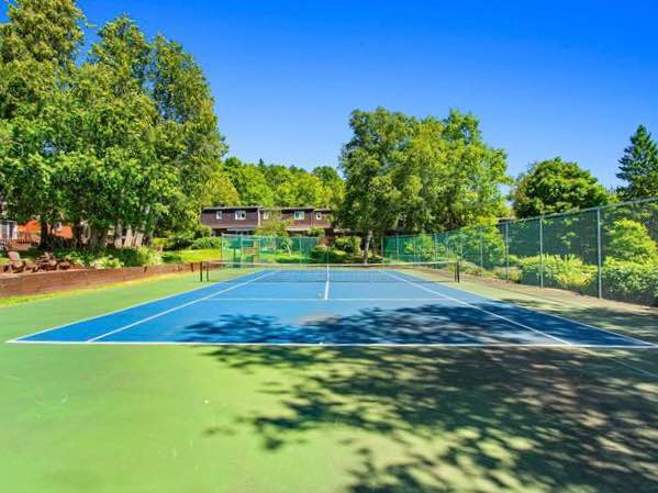 À l’extérieur, on retrouve un espace pour manger durant la période estivale et profiter du soleil. Vous aurez également accès, à quelques pas seulement, à une piscine semi-olympique ainsi qu’à un court de tennis. La verdure et la nature environnantes offrent un cadre paisible et apaisant.