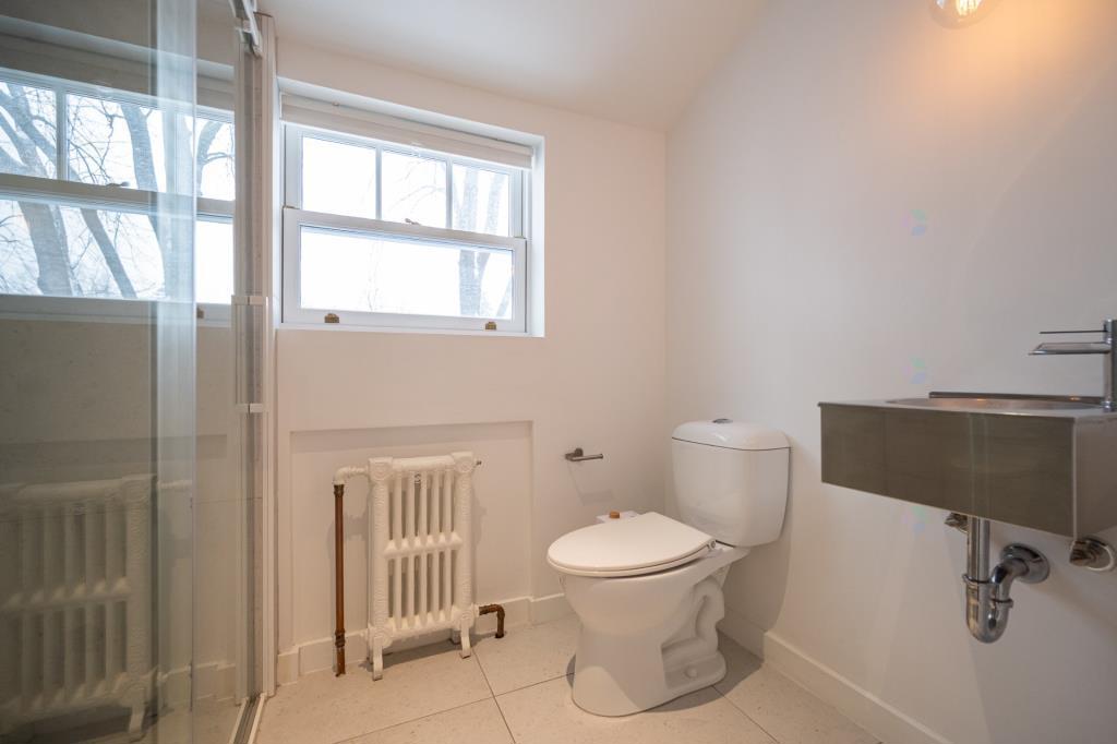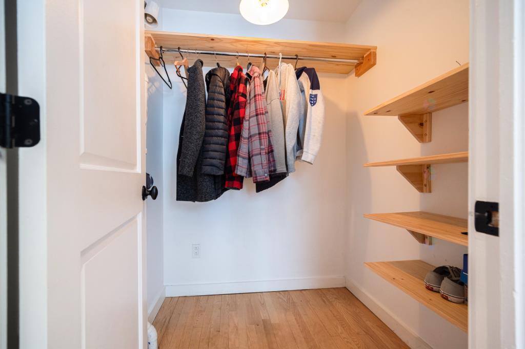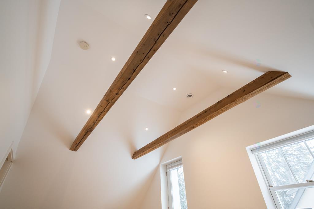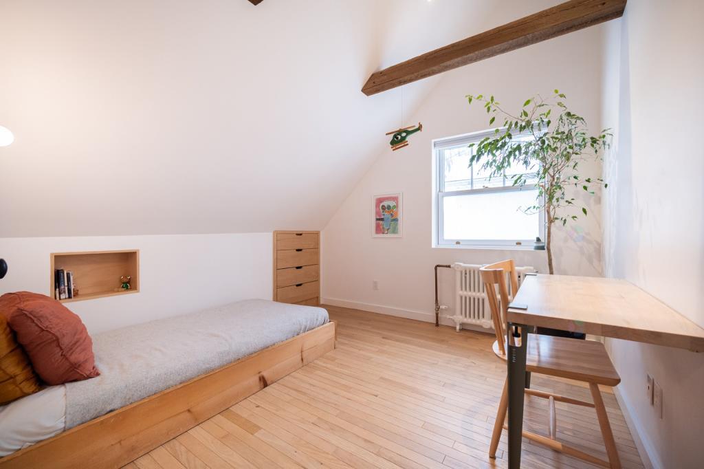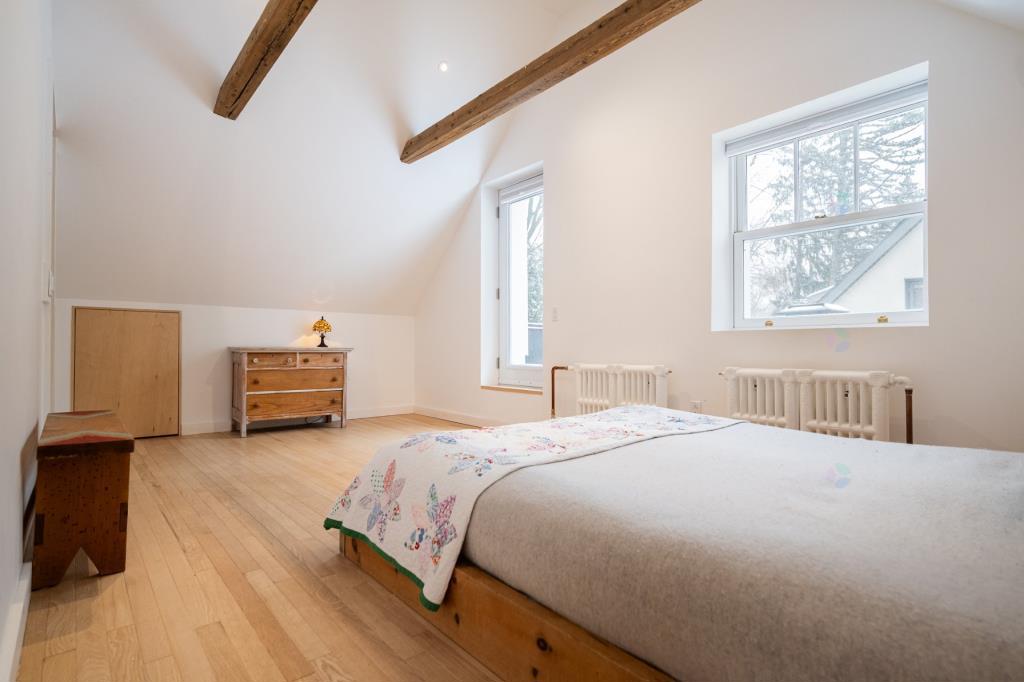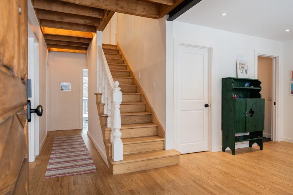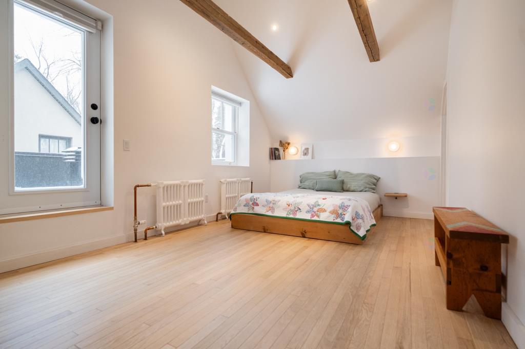 Un bel escalier aux marches et à la rampe d’origine en bois de merisier mène à l’étage. Celui-ci propose trois chambres aux plafonds cathédrale atteignant 10,10 pieds, agrémentés de poutres de bois apparentes qui renforcent le caractère unique et chaleureux de l’étage.