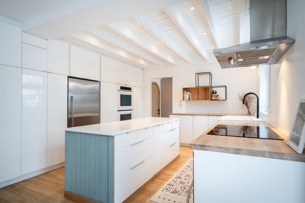 La cuisine d’inspiration européenne constitue l’un des points forts de la maison. Dotée d’armoires laquées blanches au design épuré, elle est à la fois élégante et hautement fonctionnelle. L’îlot central devient un lieu de rassemblement naturel, tandis que le dosseret et les multiples surfaces de travail en bois et en quartz répondent aux besoins des cuisiniers les plus exigeants. Équipée de deux fours encastrés, d’une plaque de cuisson et d’un plafond dégarni qui accentue la sensation d’espace, cette cuisine est un véritable paradis pour les passionnés de gastronomie. Tout y est en place pour créer, partager et savourer dans une ambiance inspirante.