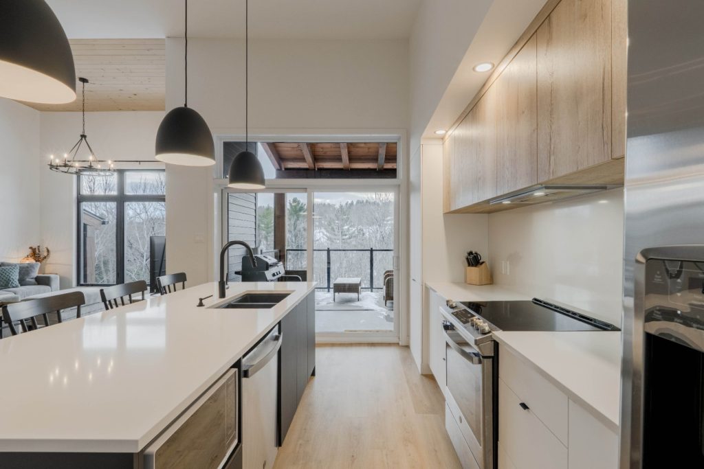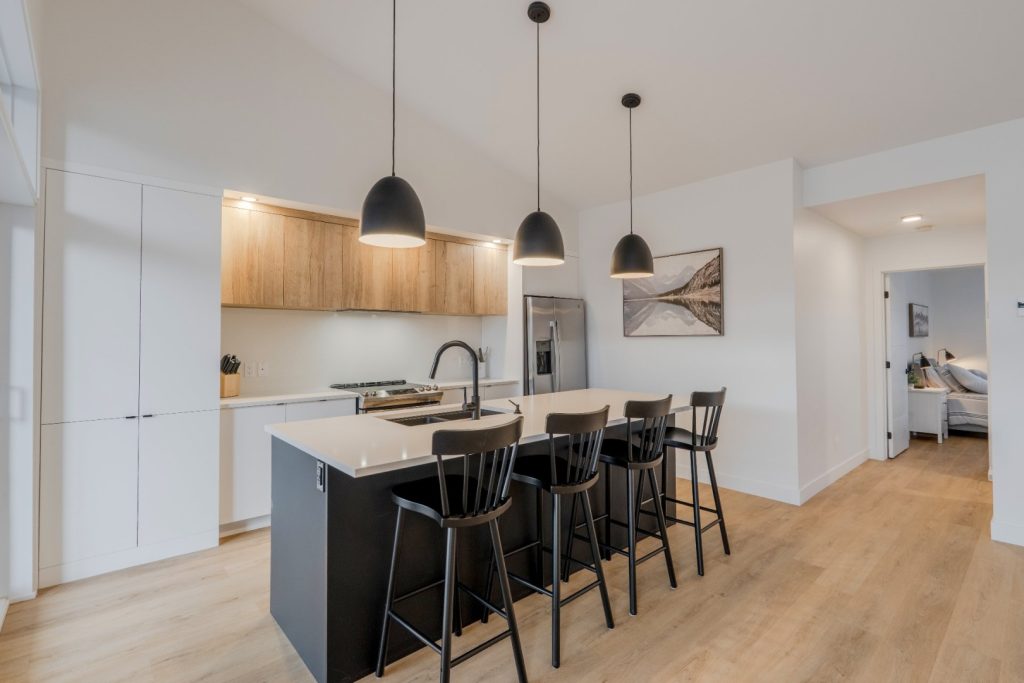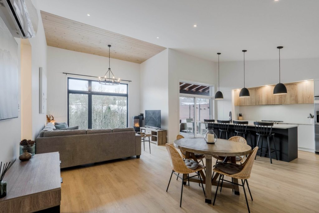 À quelques pas du salon se trouve la cuisine, épurée et contemporaine, qui plaira autant aux amateurs de design qu’aux passionnés de cuisine. Les comptoirs de quartz ajoutent une touche élégante, tandis que le grand îlot central devient rapidement le cœur de la pièce. Il invite naturellement au rassemblement, que ce soit pour préparer de délicieux repas, prendre un café ou discuter en cuisinant. La cuisine offre de nombreux rangements, plusieurs surfaces de travail bien pensées et un poêle au propane, combinant esthétisme et fonctionnalité. Juste à côté, la salle à manger permet d’intégrer une grande table, parfaite pour recevoir famille et amis dans un cadre convivial.