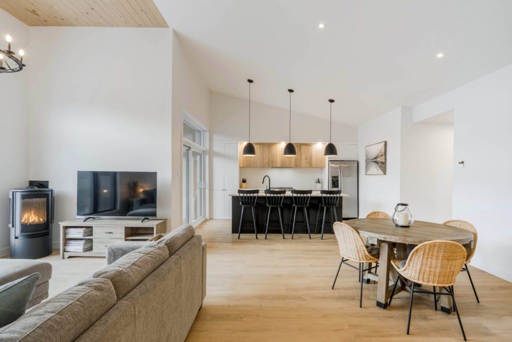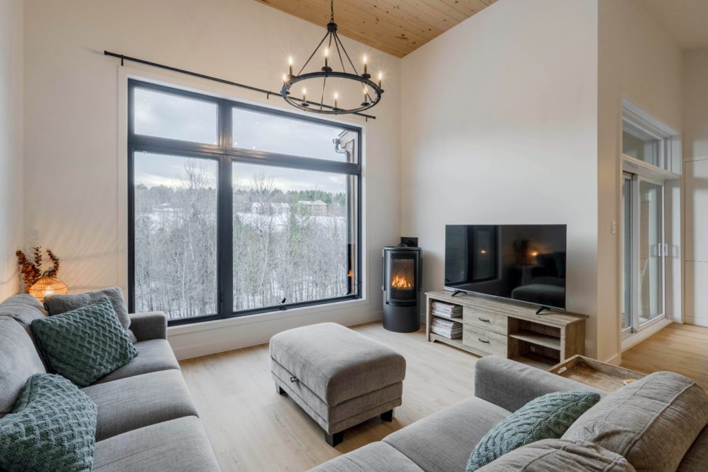 Le salon se veut intime et accueillant, tout en étant ouvert sur la nature environnante. La vue sur la forêt apporte un sentiment de calme et de connexion avec l’extérieur. C’est l’endroit idéal pour se détendre après une journée active, que ce soit pour une soirée cinéma, la lecture d’un bon livre près du feu ou simplement pour partager de belles discussions avec ses invités. L’ambiance y est propice au repos, tout en restant conviviale et chaleureuse.