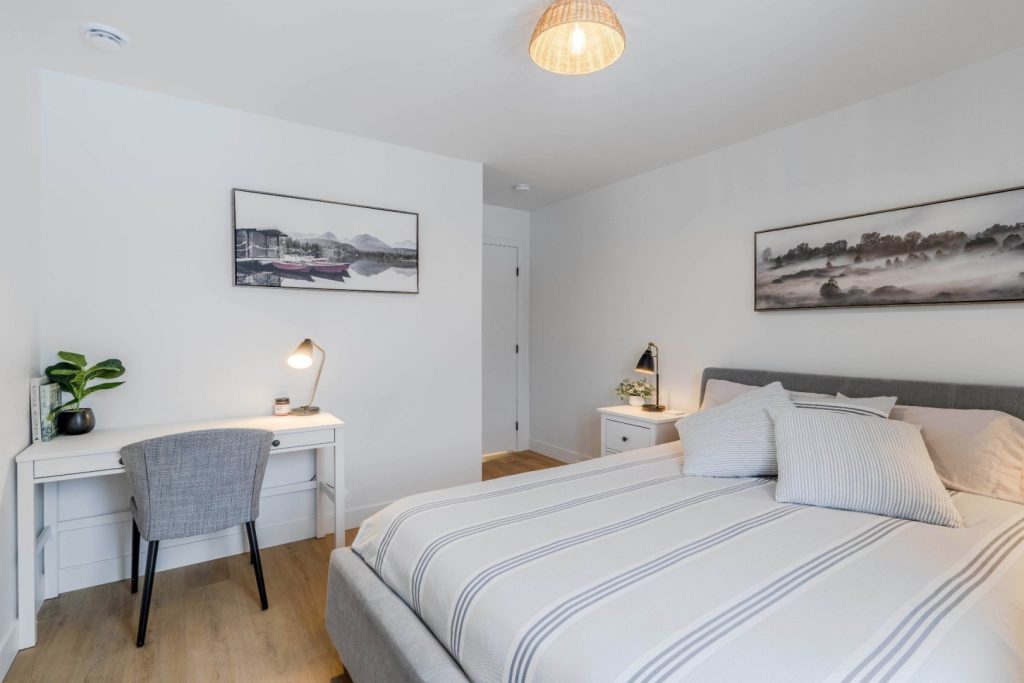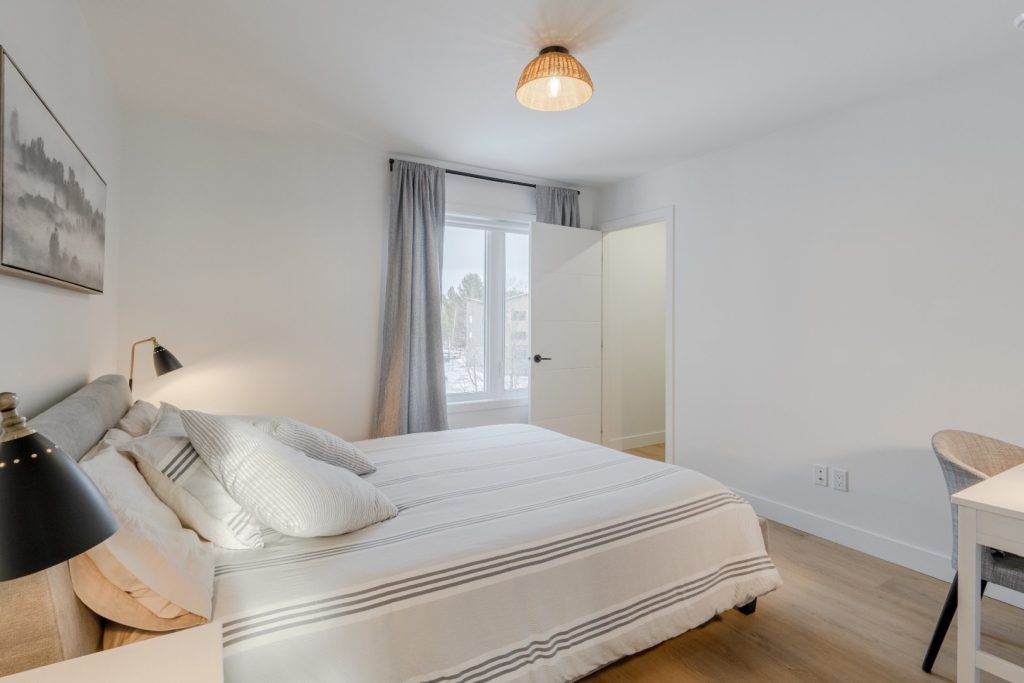 La chambre principale est d’une belle dimension et a été aménagée pour offrir confort et polyvalence. Elle dispose d’un walk-in pratique pour organiser vêtements, chaussures et accessoires de façon optimale. Un espace a également été prévu pour un bureau, ce qui est idéal pour le télétravail ou pour se consacrer à des projets personnels dans une ambiance calme et propice à la concentration.