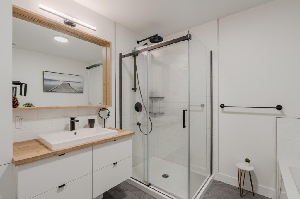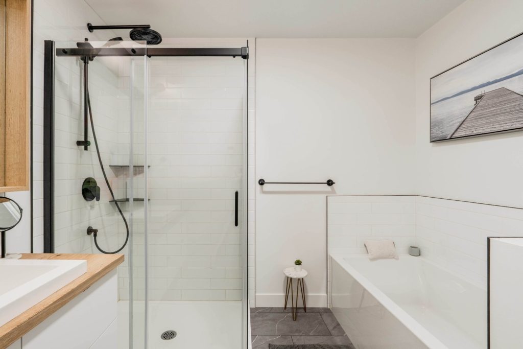 La salle de bain moderne attenante complète parfaitement l’espace nuit. Elle comprend une douche vitrée ainsi qu’une baignoire, permettant de débuter comme de terminer ses journées dans une atmosphère relaxante. Les matériaux choisis et la disposition réfléchie contribuent à créer une pièce à la fois fonctionnelle et élégante.