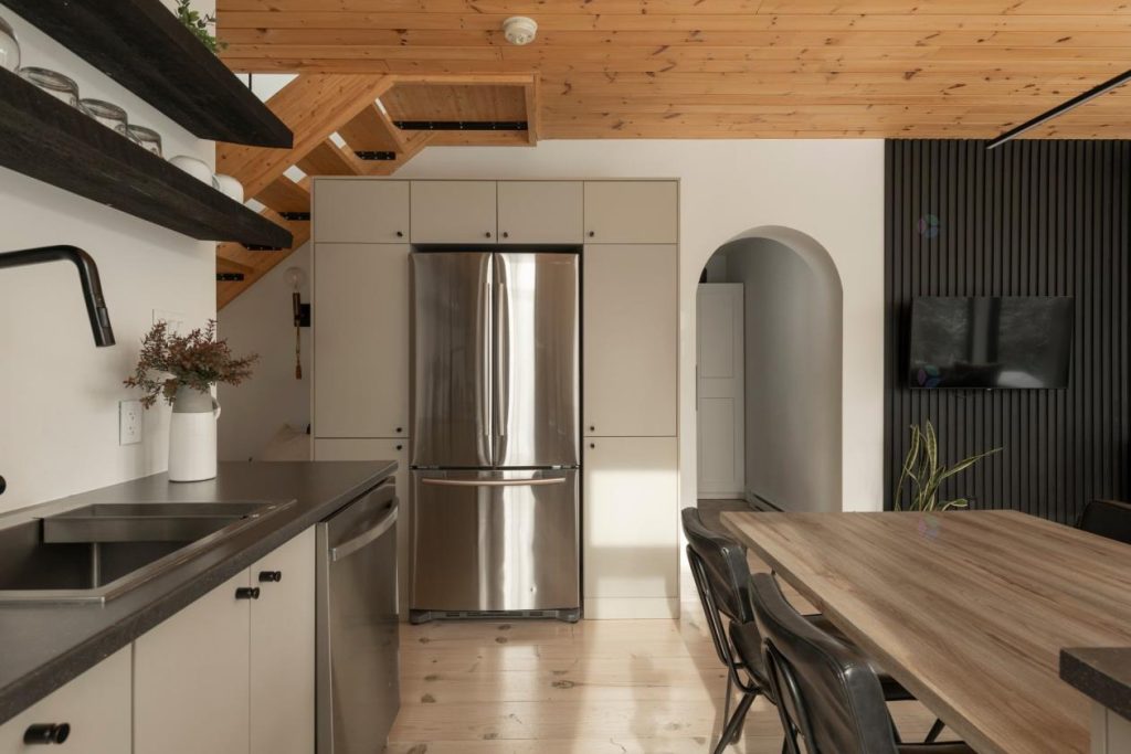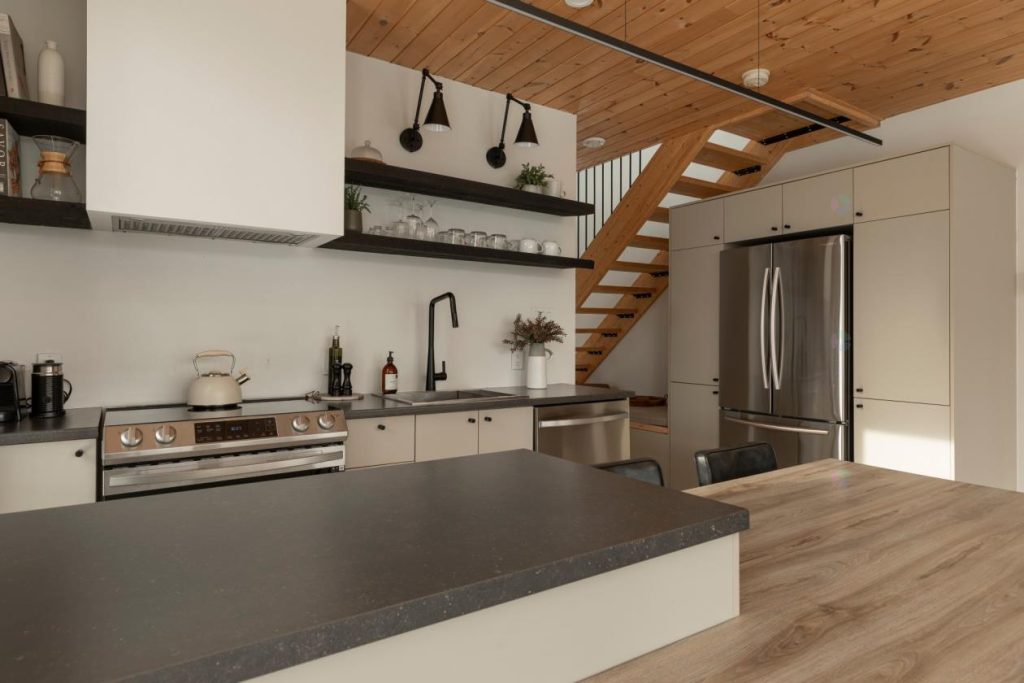 L’aire ouverte impressionne par sa luminosité exceptionnelle, rendue possible grâce aux nombreuses et grandes fenêtres qui encadrent un décor naturel enchanteur. La nature y est omniprésente et crée une ambiance apaisante à toute heure de la journée. Le salon, chaleureux et accueillant, invite à la détente, que ce soit pour une soirée cinéma, un moment de lecture ou de longues discussions entre amis. Le poêle au bois STÛV ajoute une touche de caractère et de confort, tandis que le mobilier inclus de LD Shoppe complète harmonieusement l’espace.