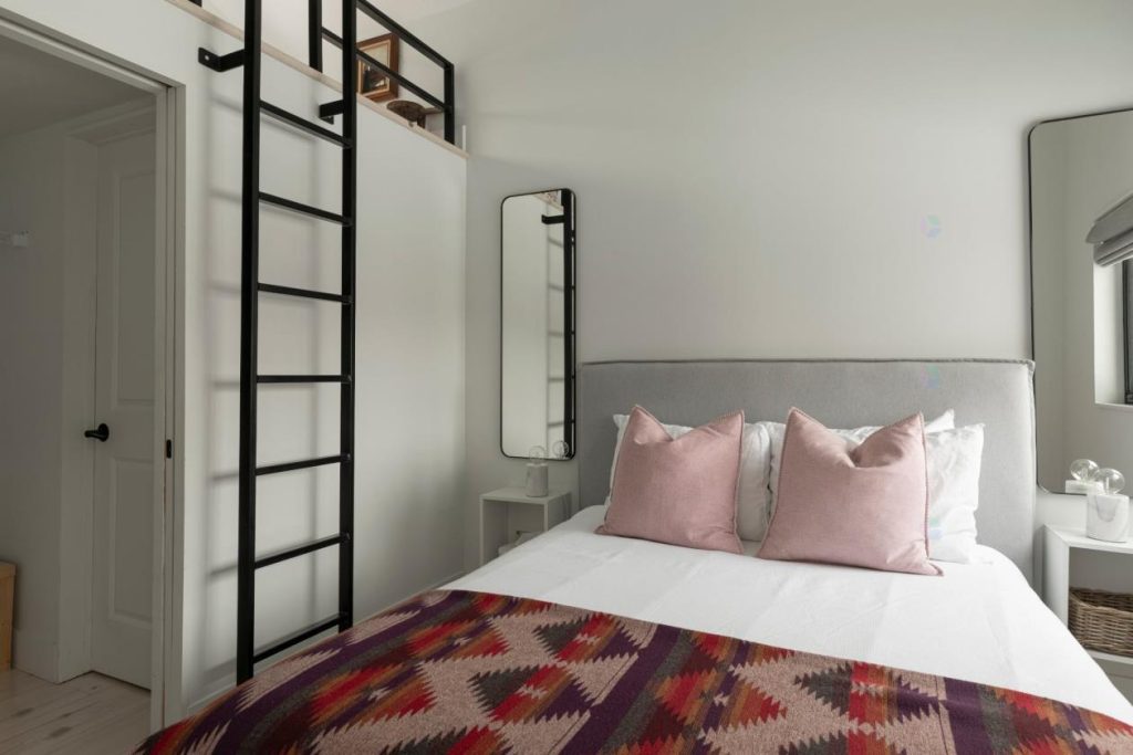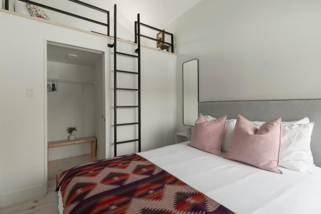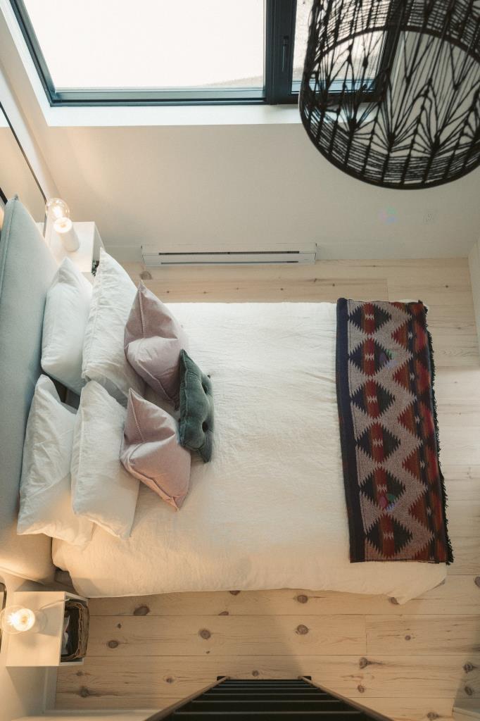 Toujours sur le même palier, on retrouve une chambre à coucher ingénieusement conçue, comprenant une mezzanine avec un second lit. Cette configuration sur deux niveaux permet d’accueillir confortablement des invités ou convient parfaitement à des enfants, chacun ayant sa propre zone. Il est également possible de transformer l’un des espaces en bureau, selon les besoins. La flexibilité de cette pièce permet d’adapter la propriété à différents styles de vie et usages.