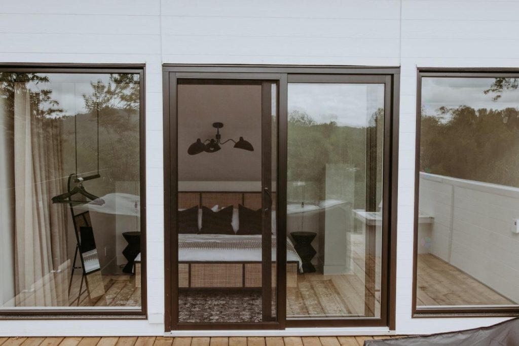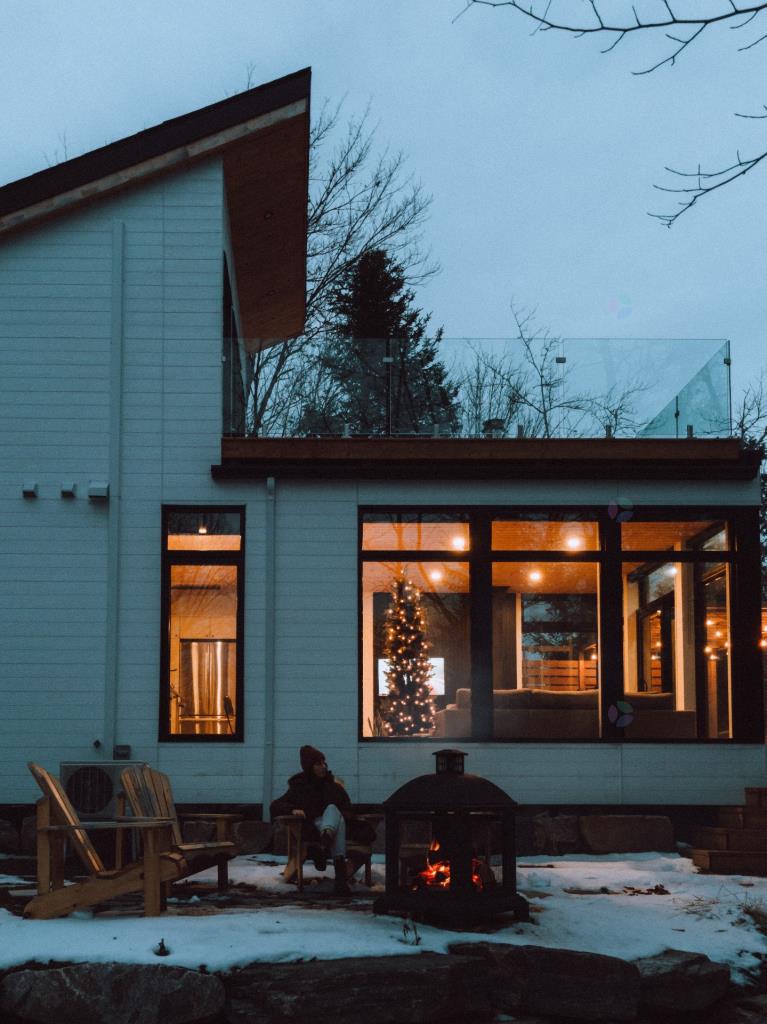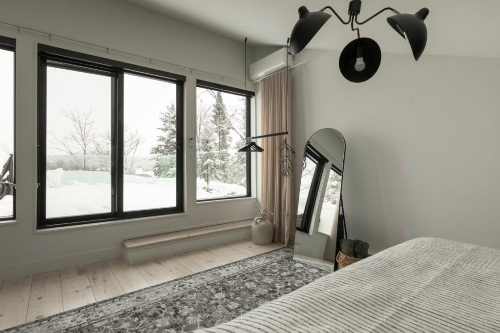 À l’étage se trouve la vaste chambre des maîtres, un véritable espace de détente. La vue y est magnifique et l’accès direct à la terrasse renforce la sensation de liberté et de connexion avec la nature. Prendre son café le matin sur la terrasse, face au Mont-Tremblant, entouré de garde-corps extérieurs en verre, devient un rituel quotidien des plus agréables pour bien commencer la journée.