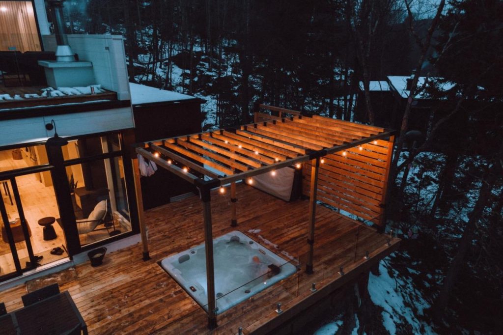 À l’extérieur, la terrasse principale propose un aménagement idéal pour profiter pleinement de l’environnement. On y retrouve une pergola et un hamac extérieur Toja Grid, ainsi qu’un spa encastré invitant à la détente. Un espace feu est également aménagé, parfait pour prolonger les soirées en bonne compagnie. Entouré par la nature, cet espace extérieur offre une atmosphère paisible et ressourçante.