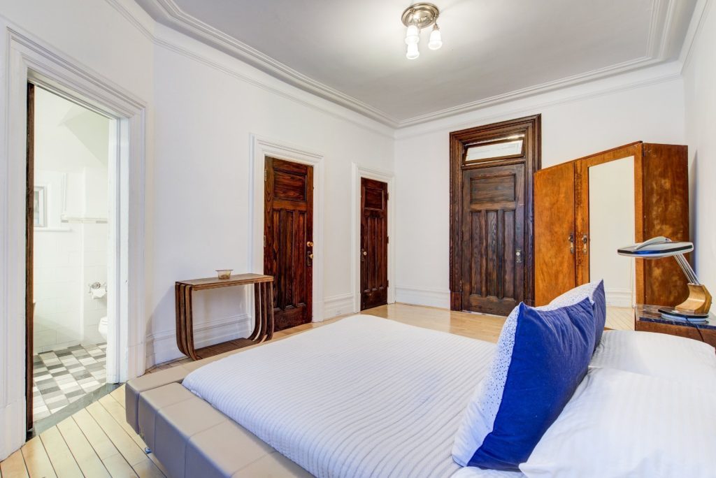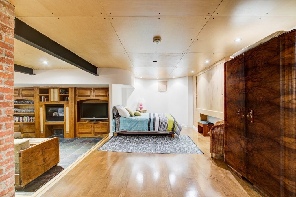 La chambre à coucher principale, très spacieuse, dispose d’une salle de bain adjacente. Elle constitue un véritable lieu de repos où tout est réuni pour favoriser la détente. Les volumes généreux permettent d’y intégrer un mobilier complet sans encombrer l’espace. La salle de bain attenante est bien aménagée et comprend un bain invitant à la relaxation, parfait pour conclure la journée dans une atmosphère paisible.