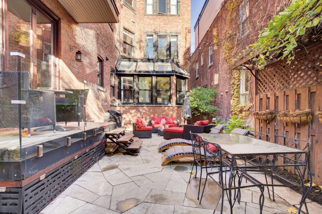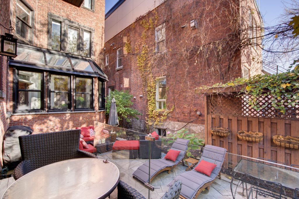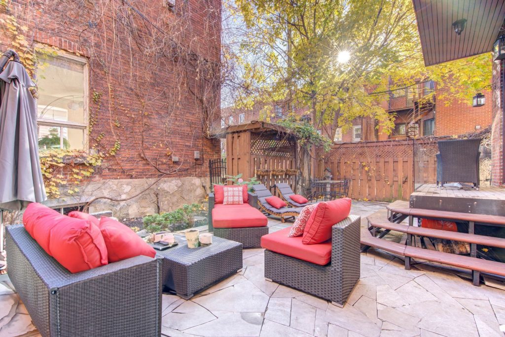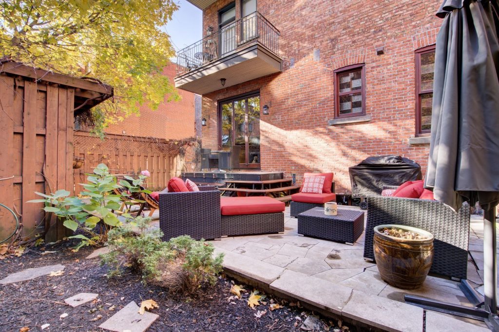 À l’extérieur, la cour arrière aménagée offre un espace privé et invitant, véritable coin de paradis en plein cœur du Plateau. Elle permet de profiter des belles journées d’été, que ce soit pour prendre un repas à l’extérieur, se détendre au soleil ou recevoir des invités dans un cadre verdoyant.