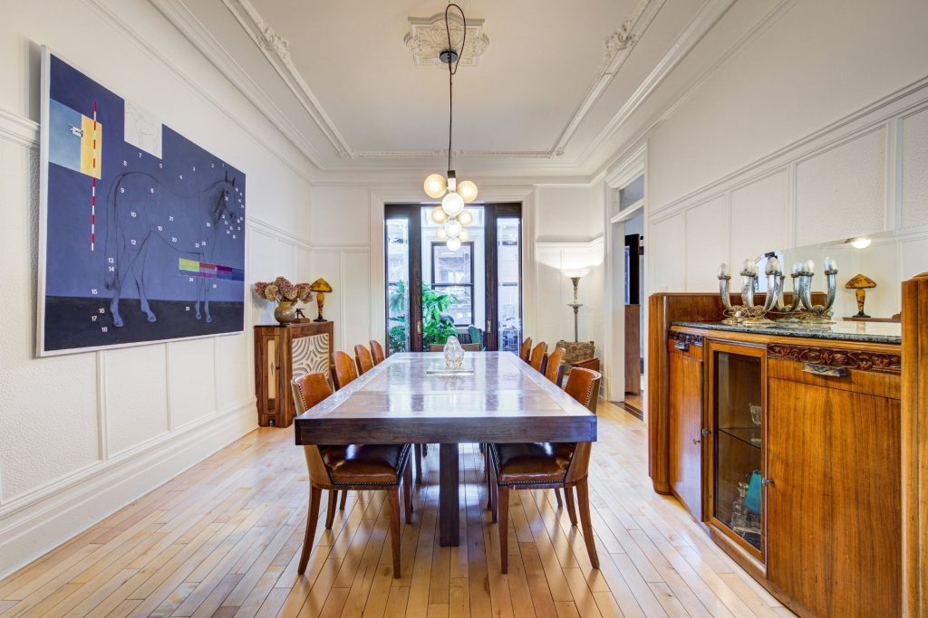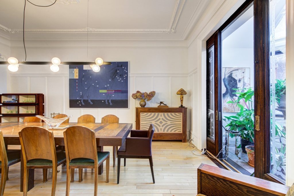 Au rez-de-chaussée, on découvre une vaste pièce double regroupant le salon et la salle à manger. Dès l’entrée, le regard est attiré par les moulures ornementales au plafond et les boiseries d’époque qui confèrent une élégance intemporelle à l’ensemble. Le salon, baigné de lumière grâce à sa fenêtre en baie, offre un espace généreux pour recevoir avec distinction. Le foyer ajoute une touche chaleureuse et souligne le cachet architectural. L’ampleur de la pièce permet également d’aménager un coin musique, par exemple avec un piano, sans compromettre la fluidité des lieux.
