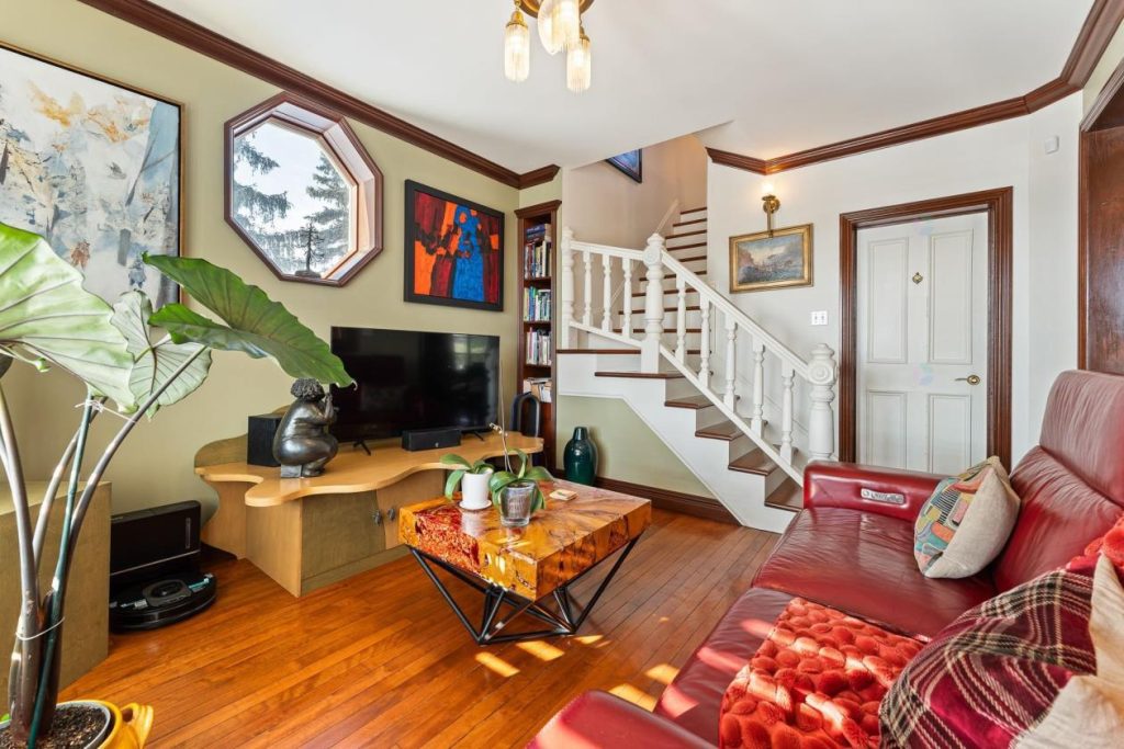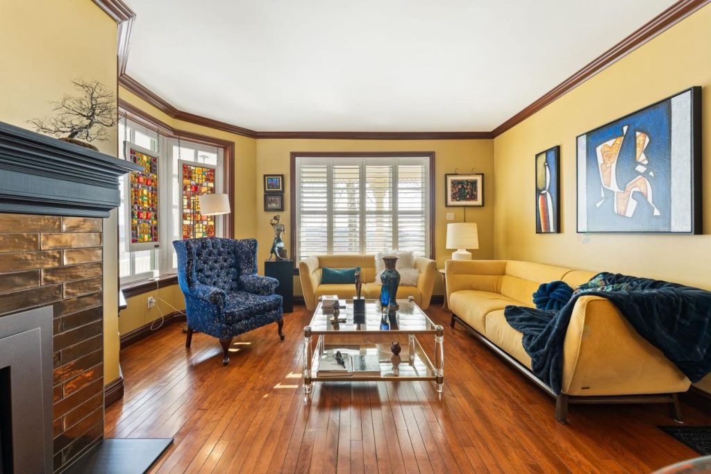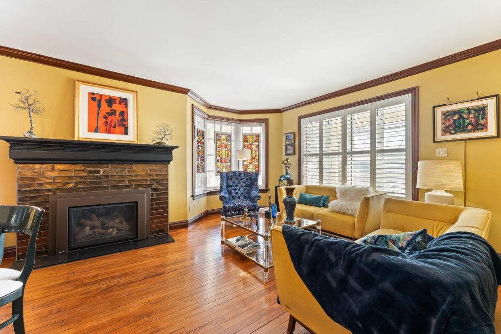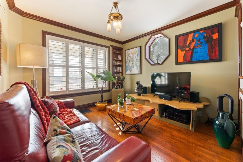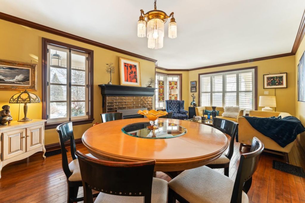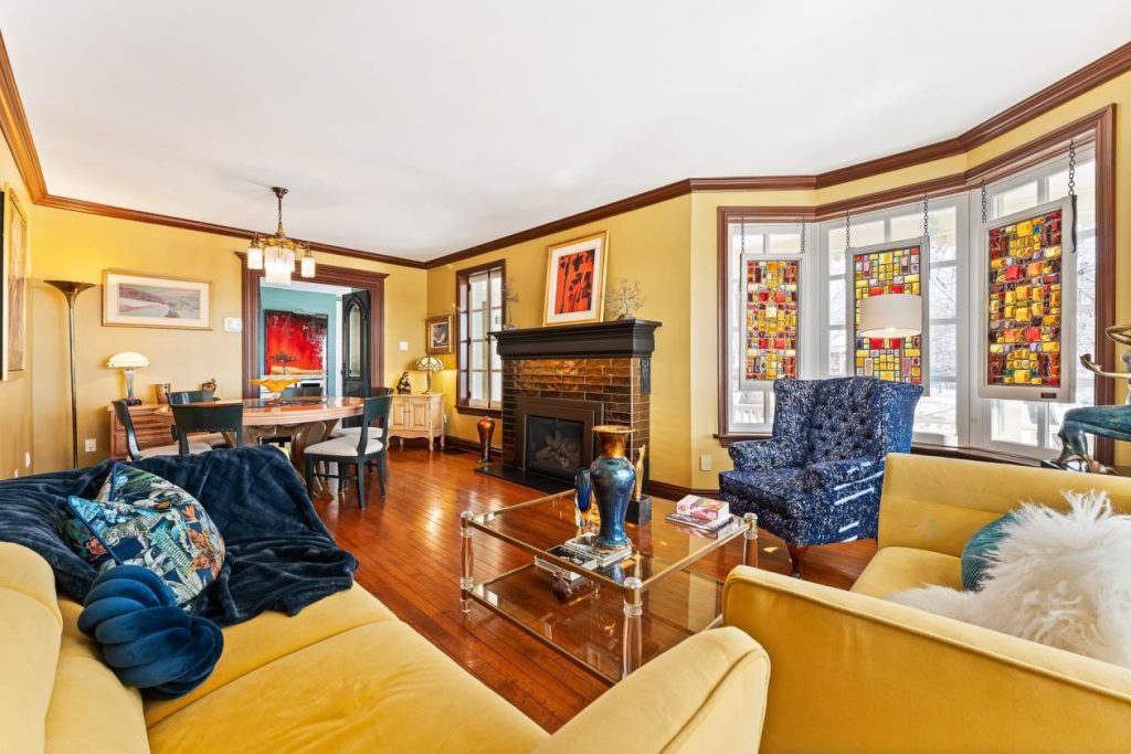 À quelques pas, le salon principal se présente comme un lieu parfait pour se détendre ou recevoir des invités. On peut s’y installer pour lire, réfléchir ou simplement profiter d’un moment de calme près du foyer au propane. Les boiseries, les moulures et les détails architecturaux apportent un cachet classique et intemporel, donnant à la pièce une identité forte et raffinée.