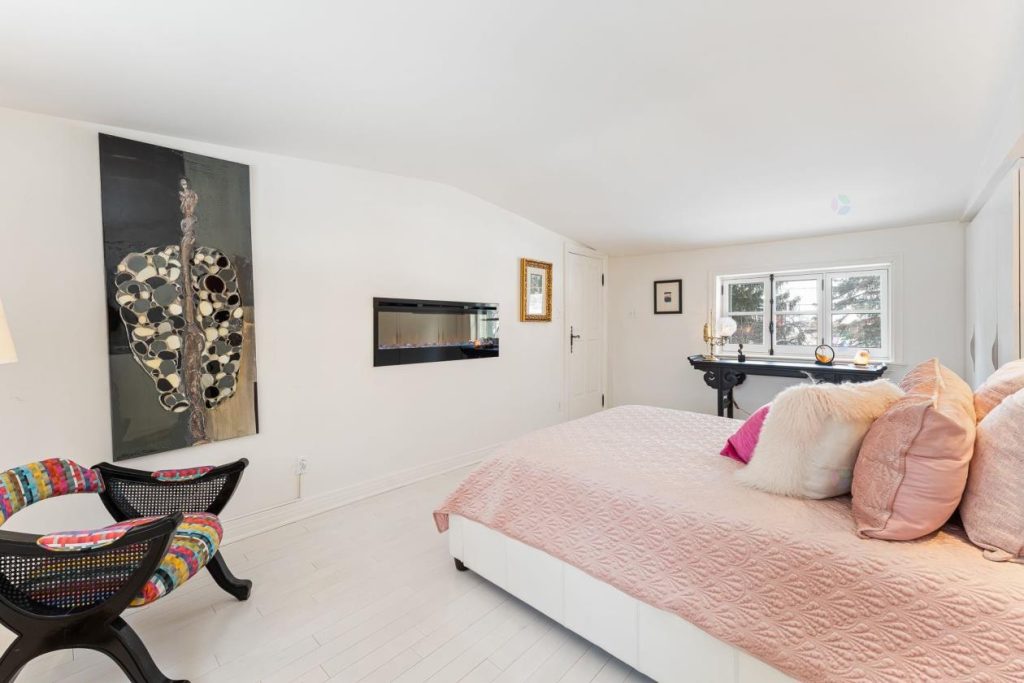 À l’étage se trouve la vaste chambre à coucher principale, pensée comme un véritable lieu de repas. La présence d’un foyer accentue le caractère enveloppant de la pièce et invite à la détente. Tout est mis en œuvre pour créer un environnement calme et apaisant, où il fait bon se retirer en fin de journée. Les volumes généreux et l’atmosphère douce contribuent à une sensation de confort.