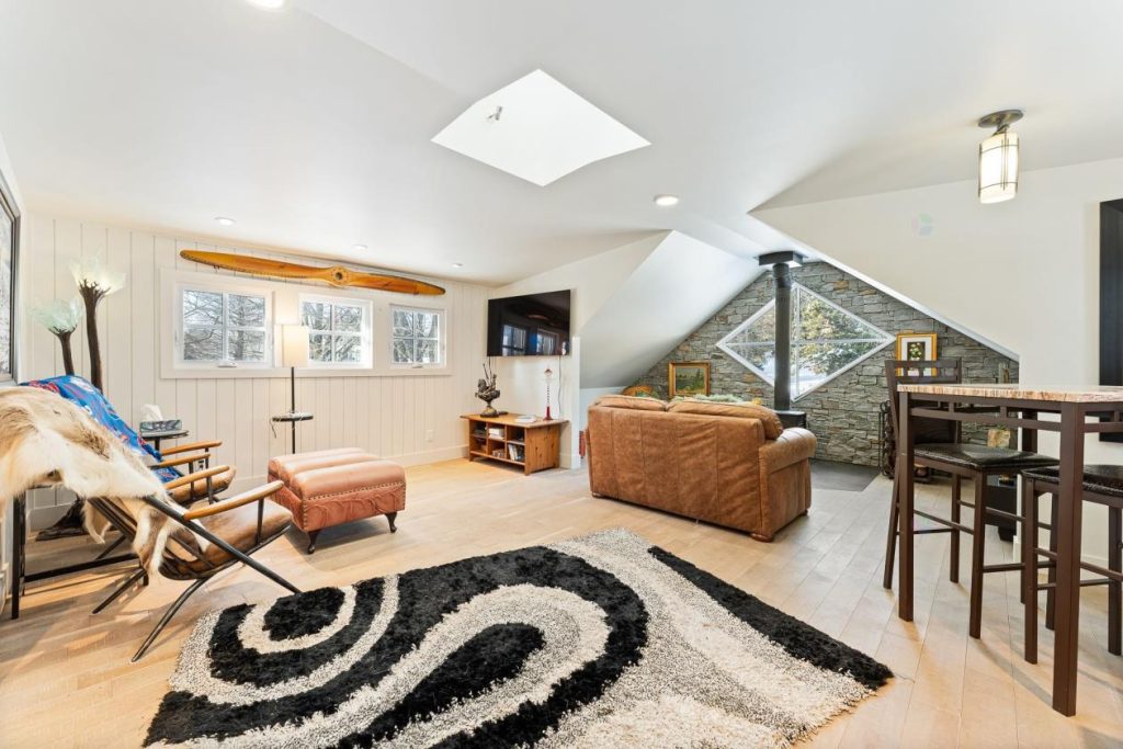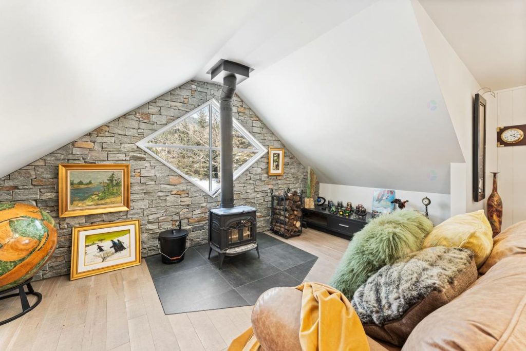Au-dessus du garage, un loft entièrement aménagé ajoute une dimension supplémentaire à la propriété. Baigné de lumière naturelle et doté d’un foyer au bois, cet espace polyvalent peut servir de salle familiale, de bureau ou de lieu de détente. Sa configuration permet de multiples usages selon les besoins et les envies des occupants.
