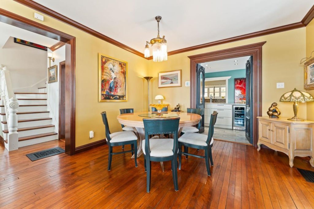 À proximité de la cuisine se trouve la salle à manger, un espace généreux où il est facile d’installer une grande table afin d’accueillir famille et amis. La disposition de la pièce favorise les échanges et les moments partagés autour d’un bon repas. L’ambiance y est chaleureuse, propice aux longues conversations qui se prolongent bien après le dessert. La proximité avec la cuisine facilite le service et rend l’expérience des réceptions encore plus agréable.